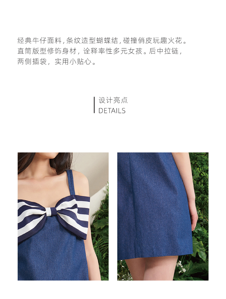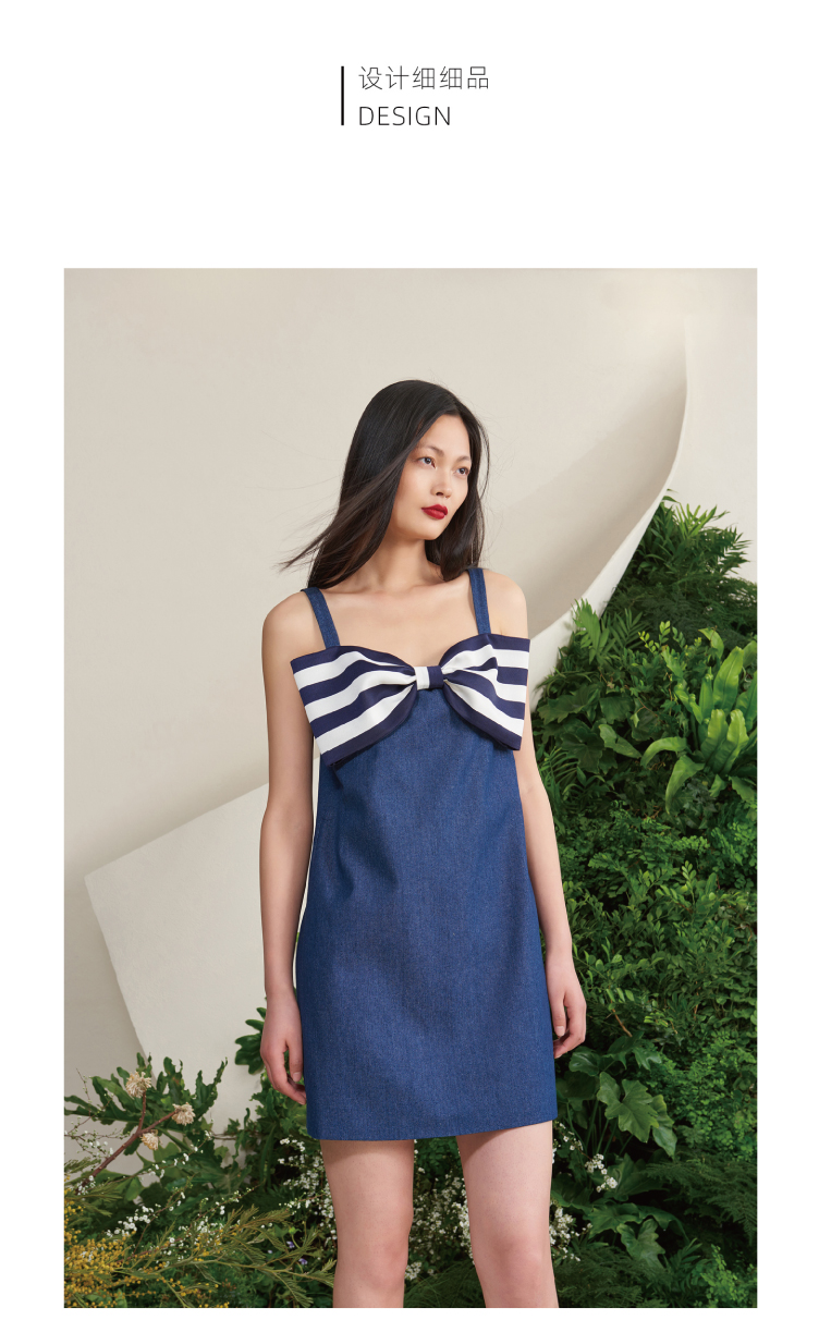 【白日幻想家】蓝白条造型蝴蝶结直筒吊带牛仔连衣裙/0000686