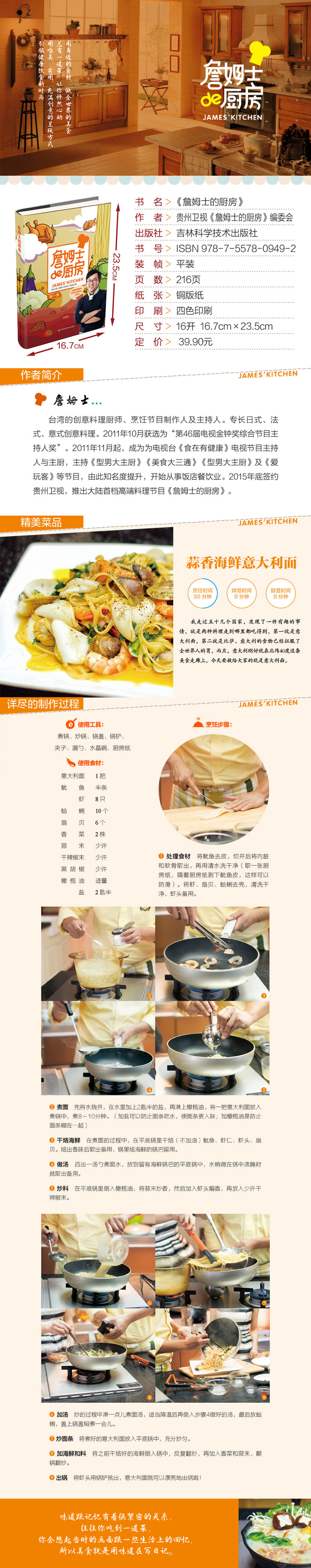 詹姆士用身边食材,烹饪世界美食。在北纬40度这一人文、饮食文化*为丰富的地理区域,选择菜例、食材,进行烹饪加工。在家轻松做料理,和大厨学习挑选食材,自己亲手做料理,美味无需等待。有詹姆士亲自按照步骤传授的料理制作步骤,分享简单却更加美味的秘诀,一本书集合先食先饱的主食、中国菜、异国美食风味、小食随手做四大部分,包涵简单的炒饭,奶香的烘焙,香嫩的牛排,别具风味的零食......原来料理就这么轻松简单,简单又美味,这才是真正的家庭料理。