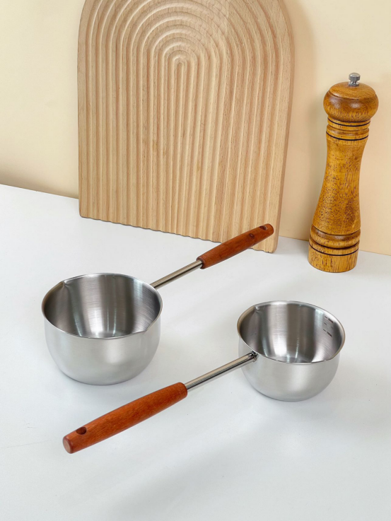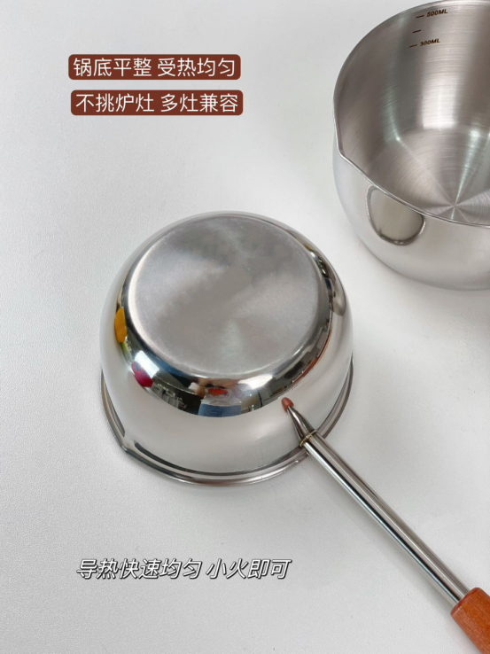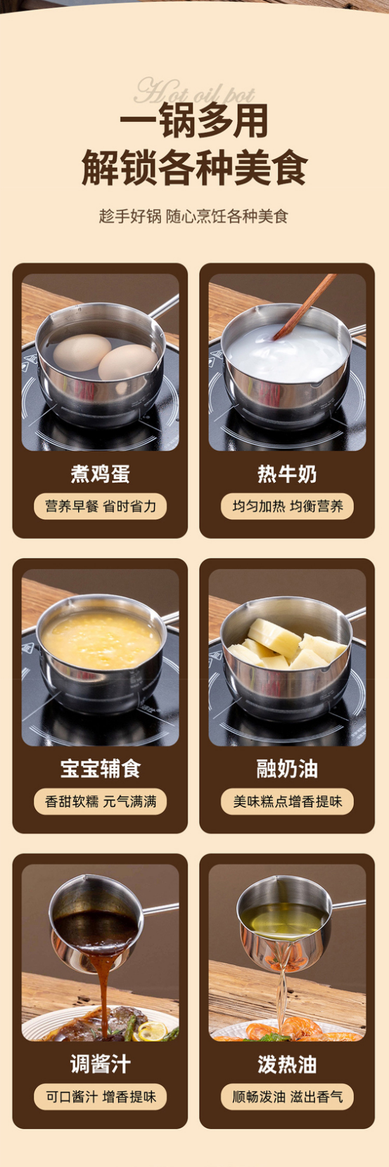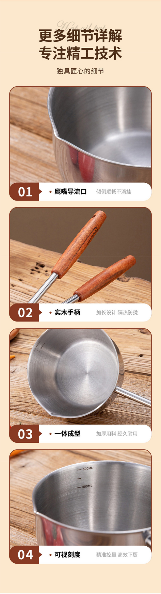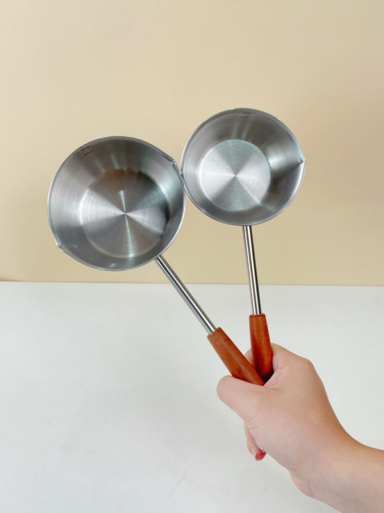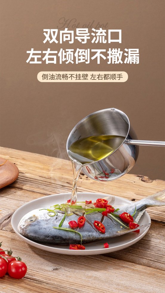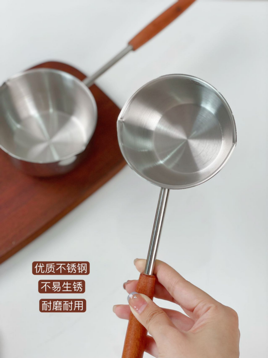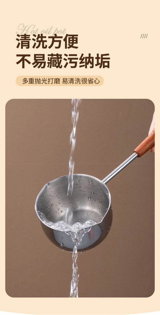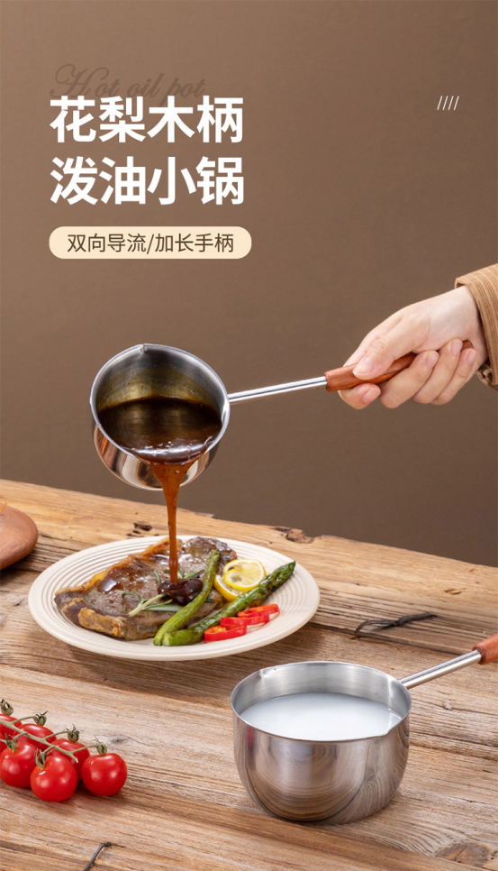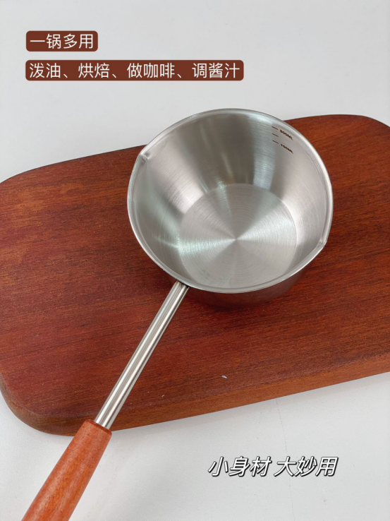 ✅不锈钢材质,搭配木质手柄质感满满 ✅小巧精致,有刻度,油量很好控制 ✅双向导流,倒油方便,导热迅速 ✅两种规格,多种用途,满足你的日常所需