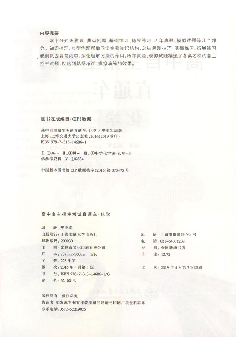 正版 高中自主招生考试直通车 化学 上海交通大学出版社 初中资优生教程优等生学习资料讲义 重点高中自主招生考试复习用书