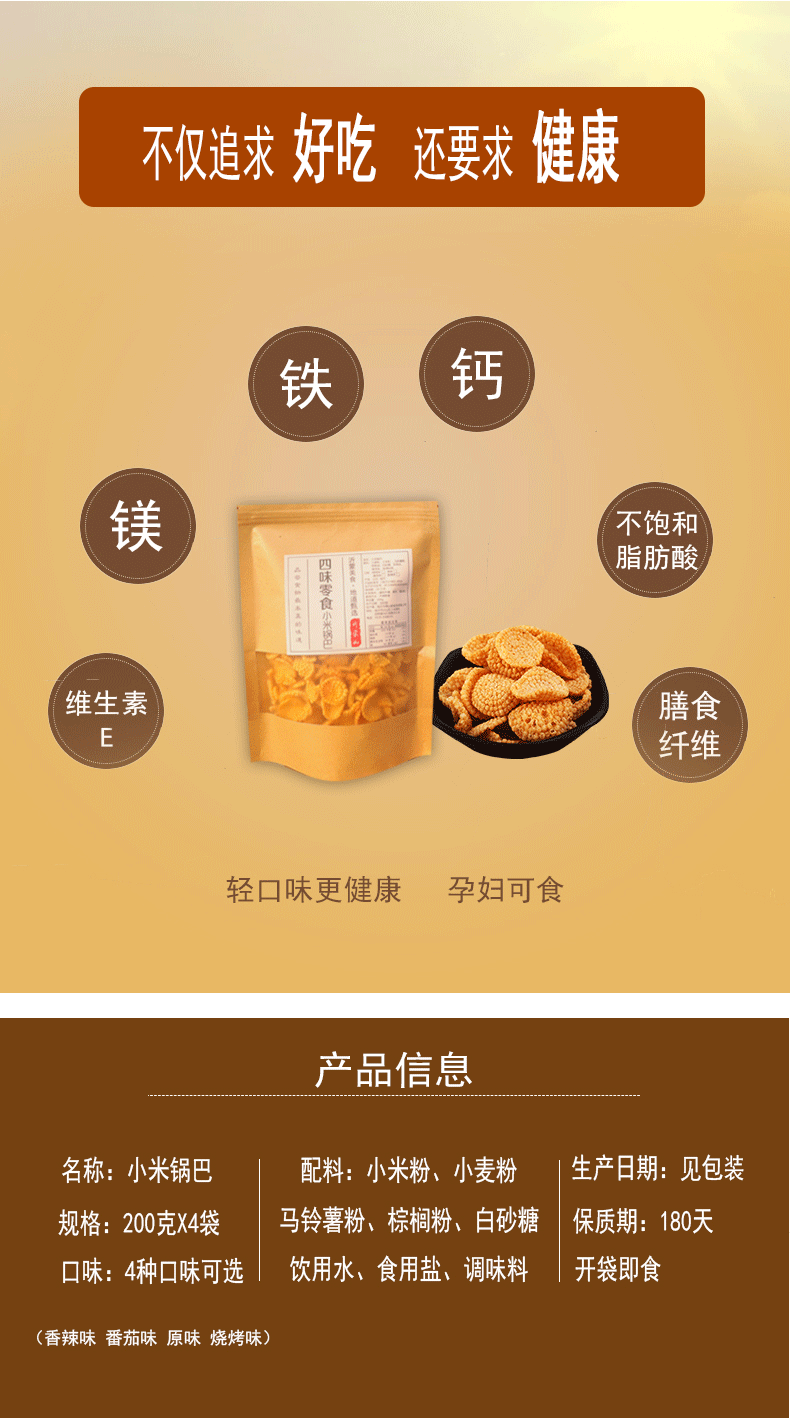 品名:黄小米锅巴规格:200g/袋发货地/产地:山东/山东保质期: 180天,建议收到后尽快食用。包装方式:袋装物流信息:四通一达或其它快递随机发货,不接受指定快递。不发货区域:新疆、西藏、港澳台、疫情管控区。 |