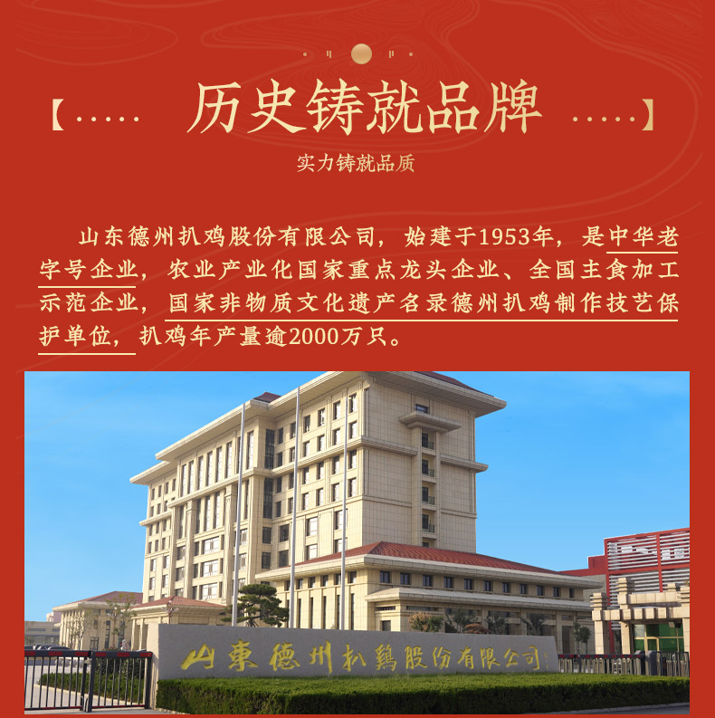 - 山东德州扒鸡股份有限公司始建于1953年,前身为中国食品公司德州市分公司,是一家以生产经营德州扒鸡为主的禽类熟制品生产企业,系农业产业化国家重点龙头企业、全国主食加工示范企业、中国肉类食品行业强势企业