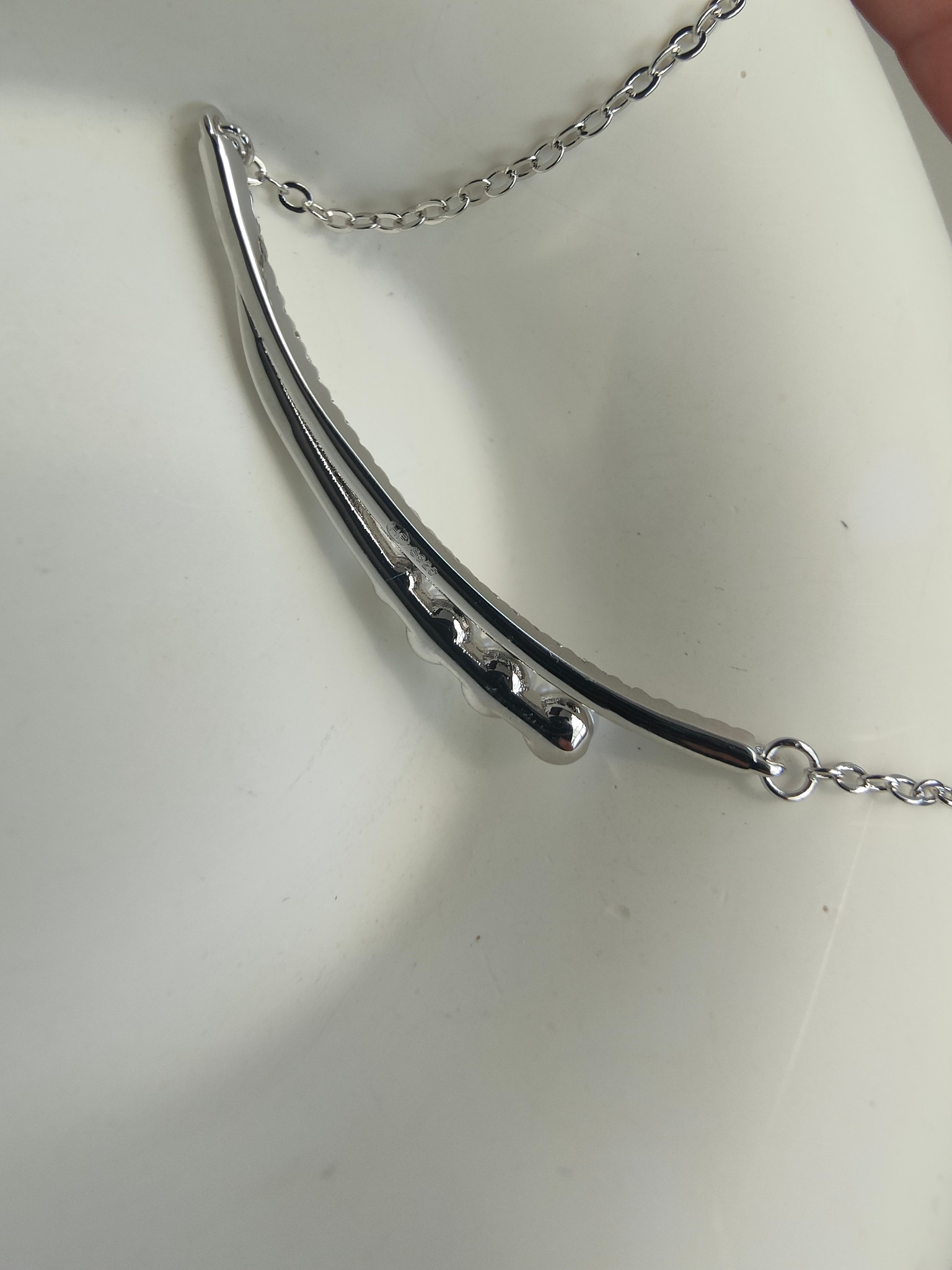 大小渐变白贝珠错落排列,还原香槟中气泡流动的趣味,手工满镶锆石折射闪耀星光,注入灵动,经典 44.7°微笑弧度,超级修饰锁骨线条!