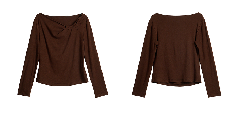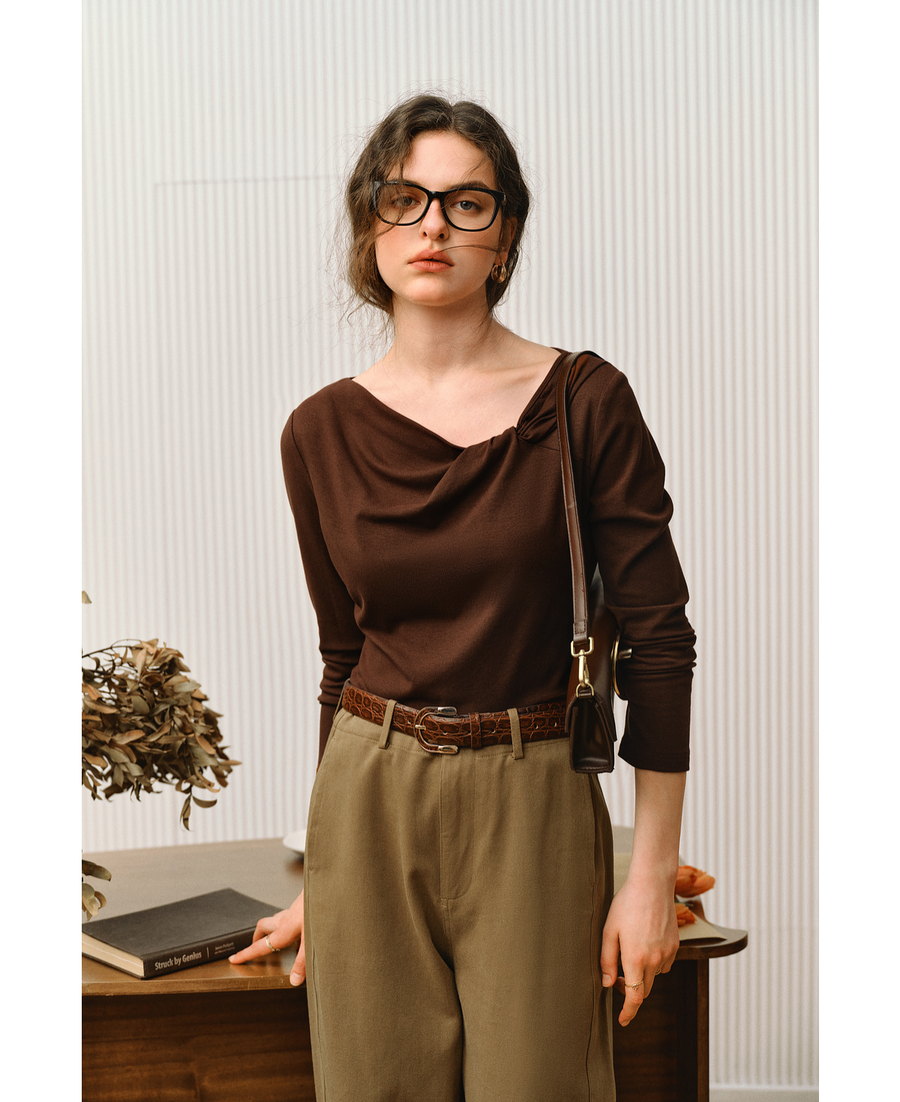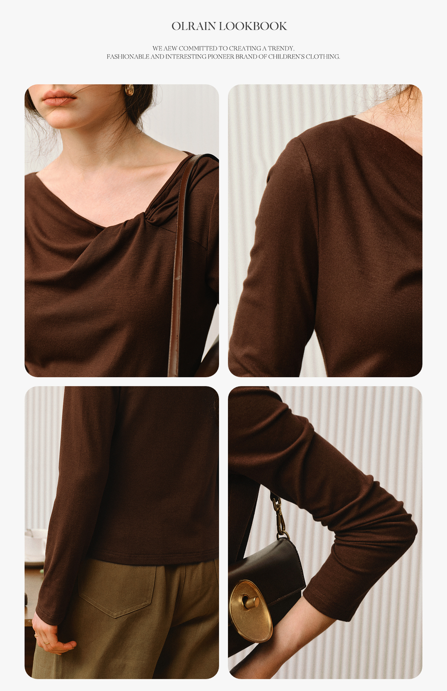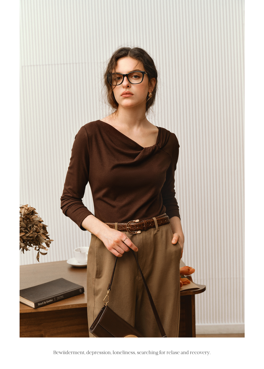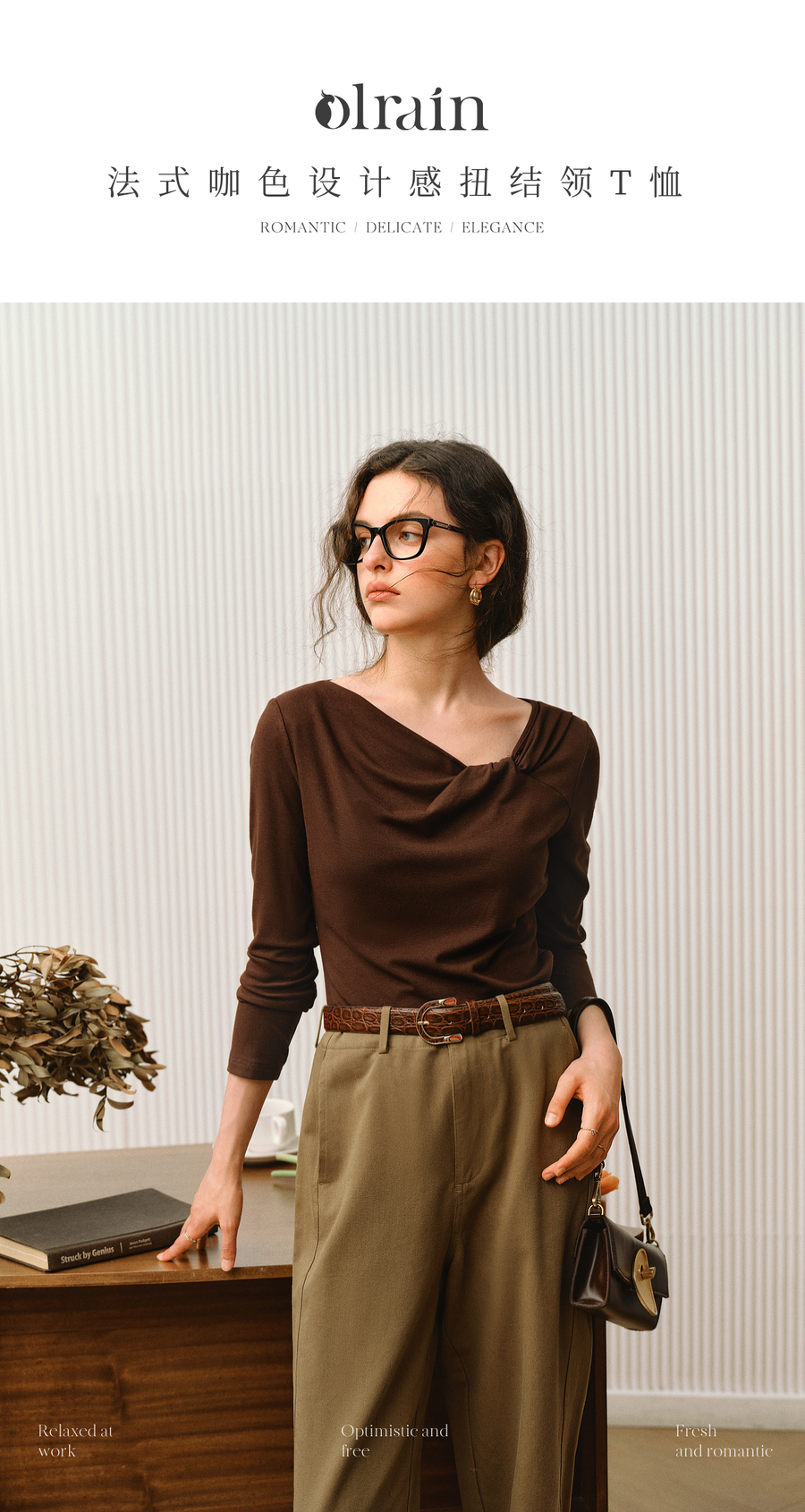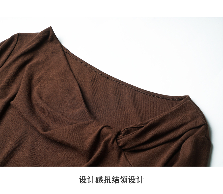 OLrain欧芮儿2025新款女秋季法式咖色设计感扭结领T恤长袖上衣