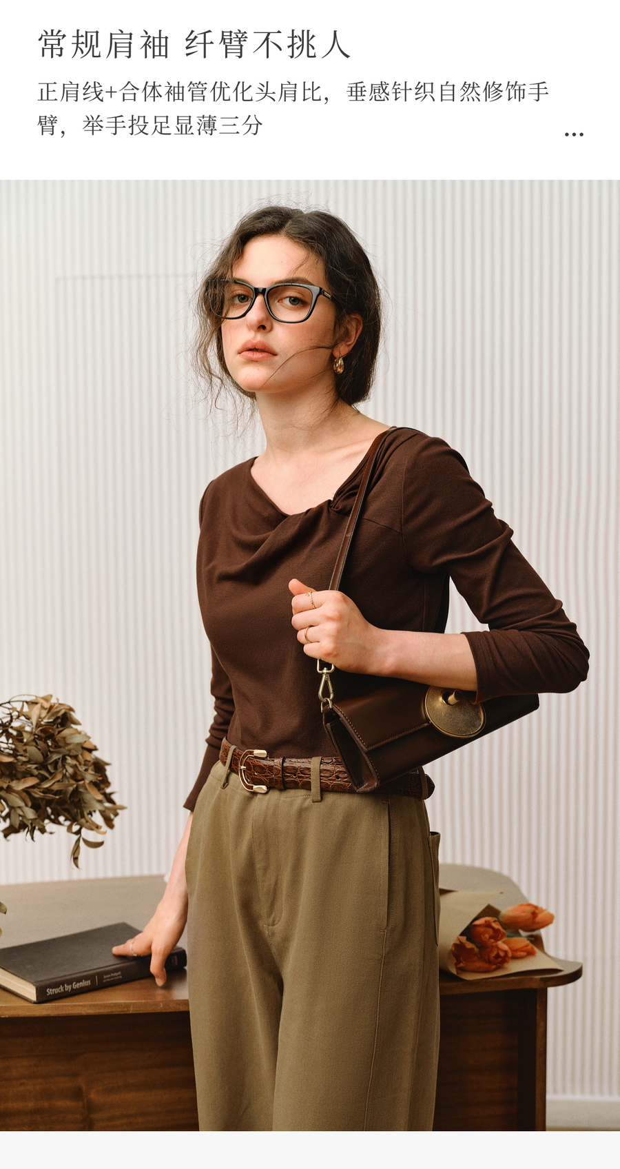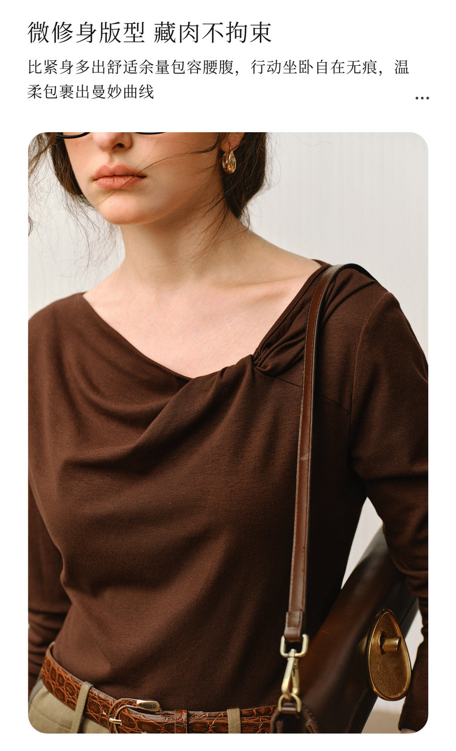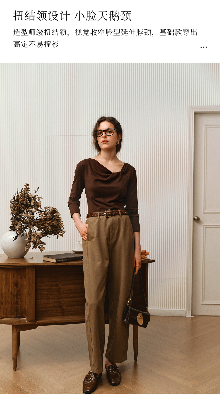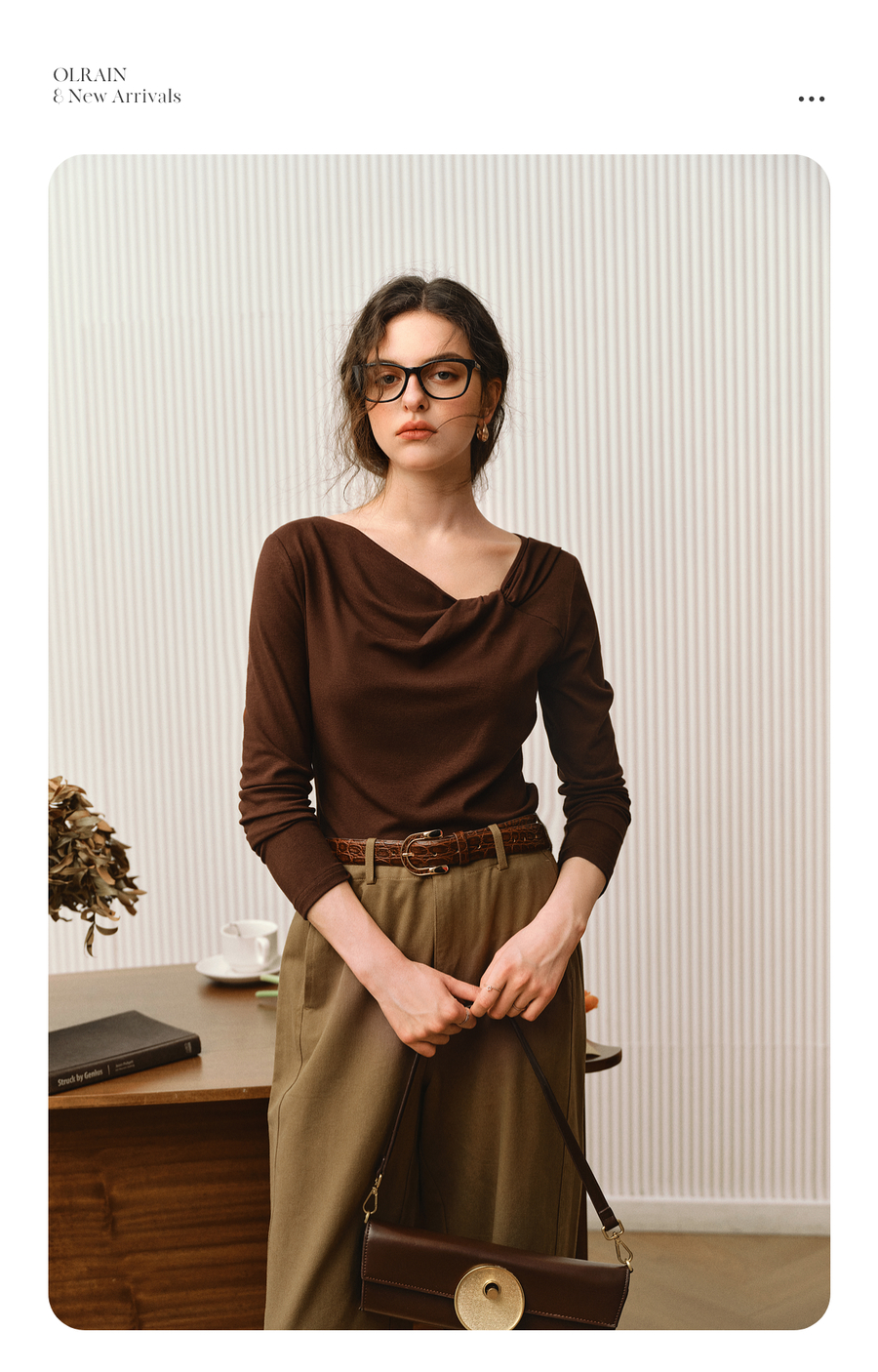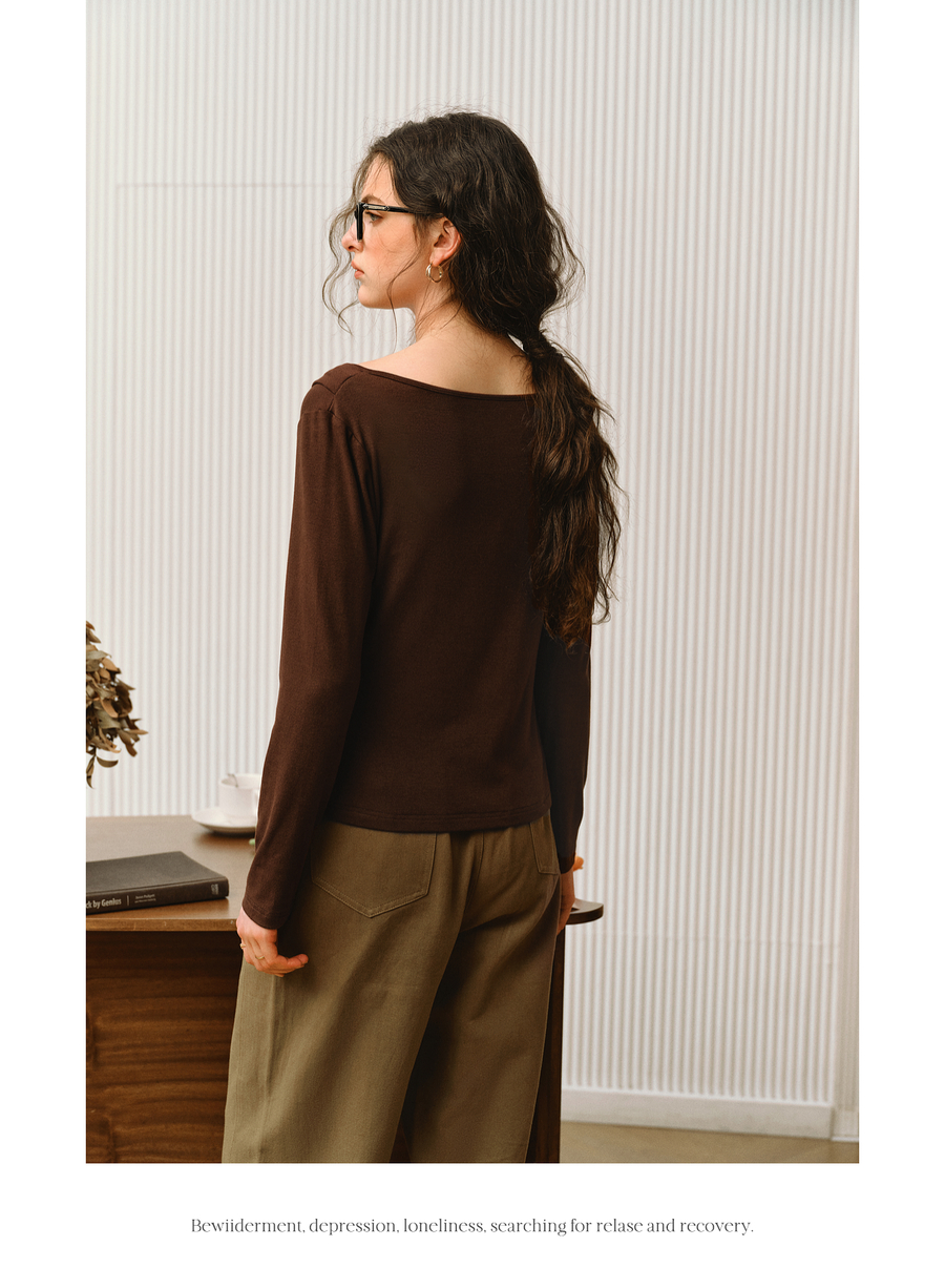 OLrain欧芮儿2025新款女秋季法式咖色设计感扭结领T恤长袖上衣