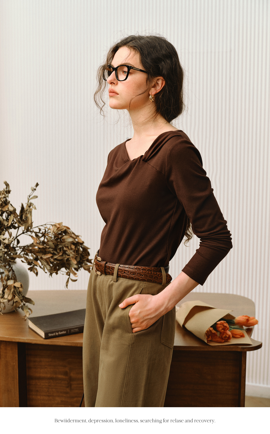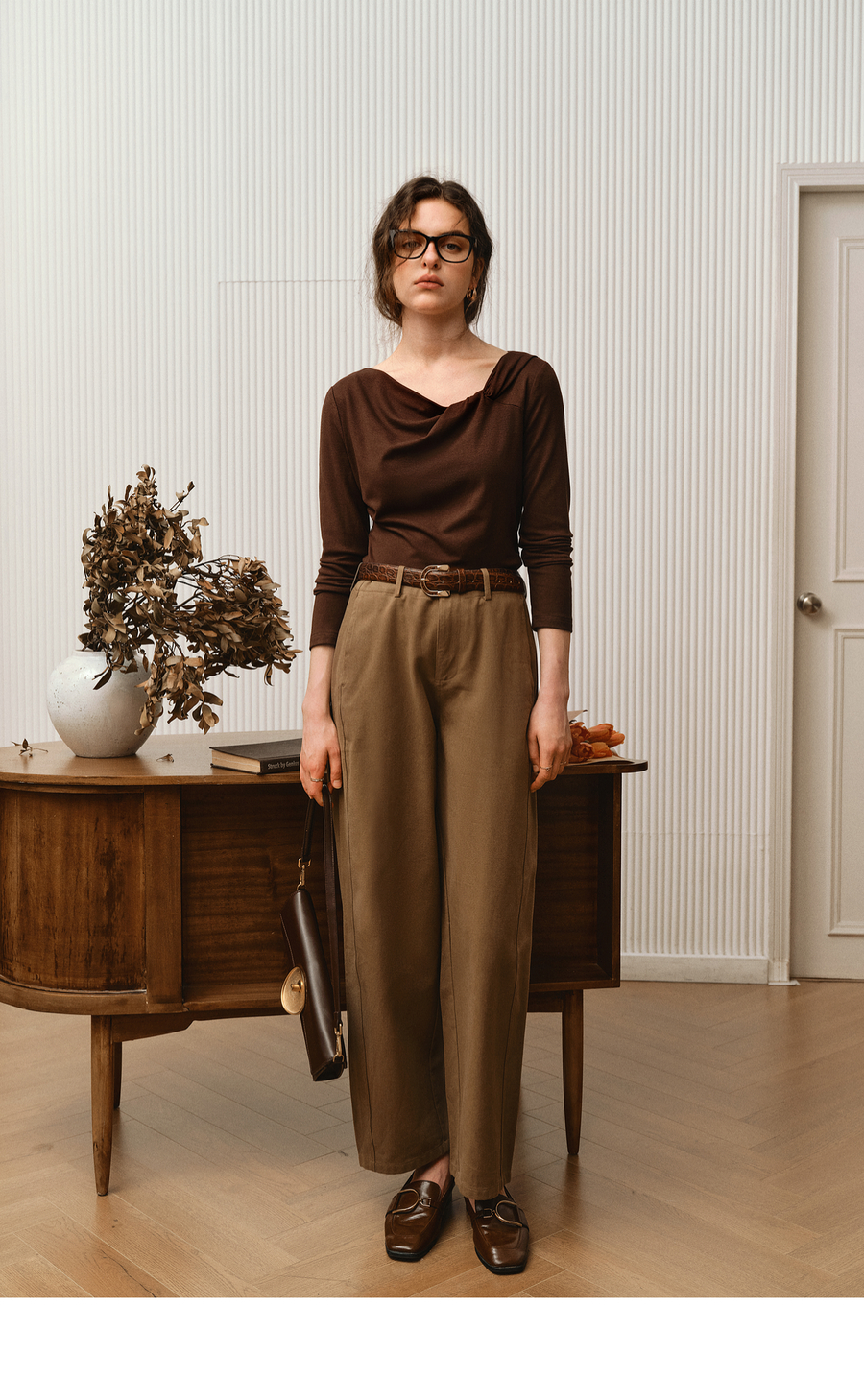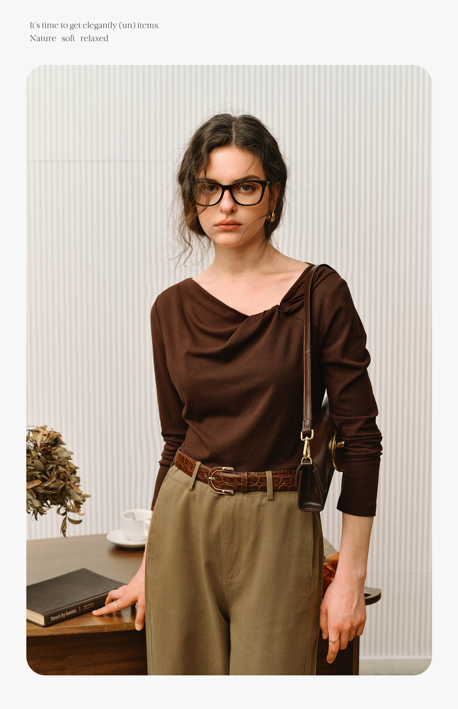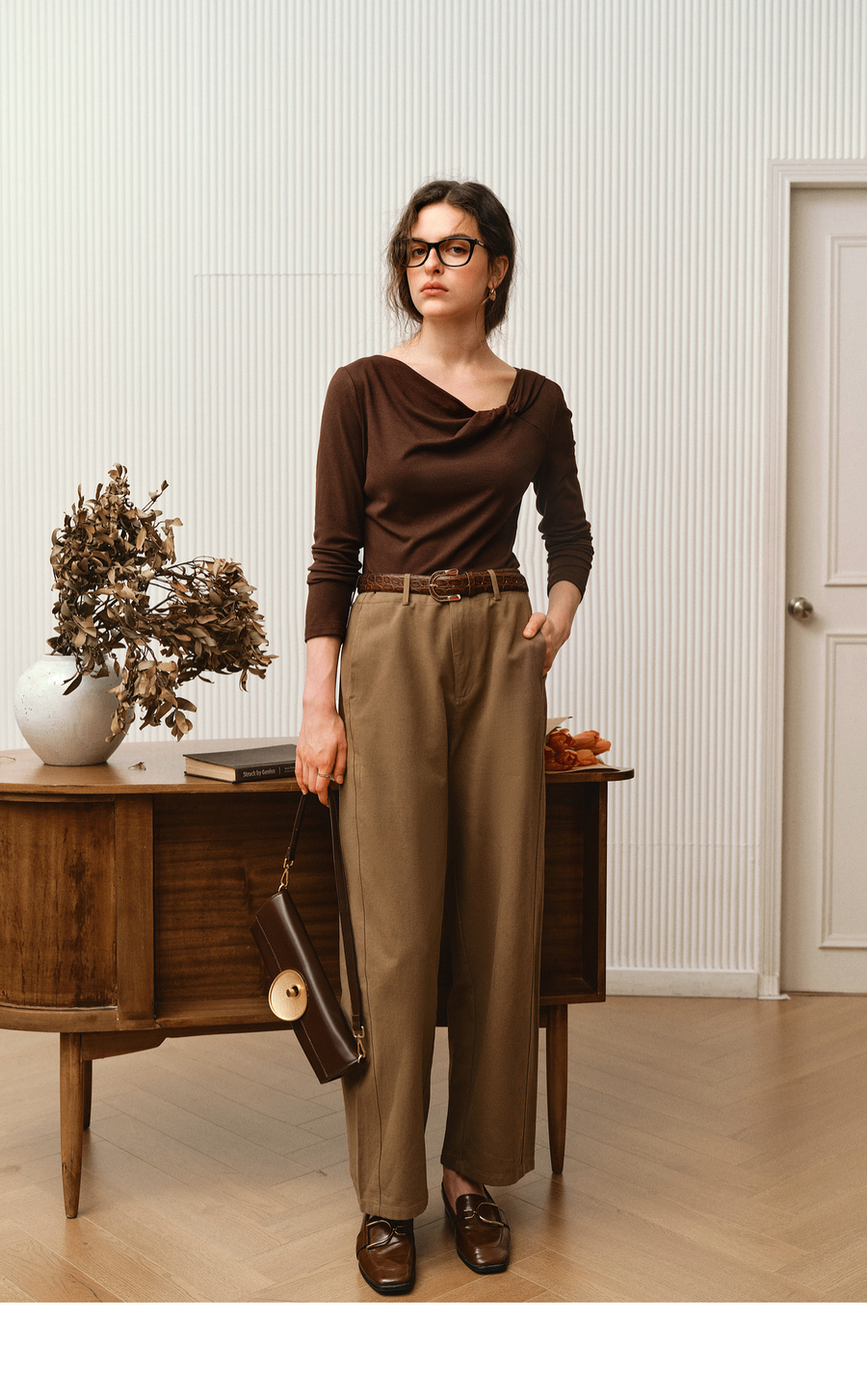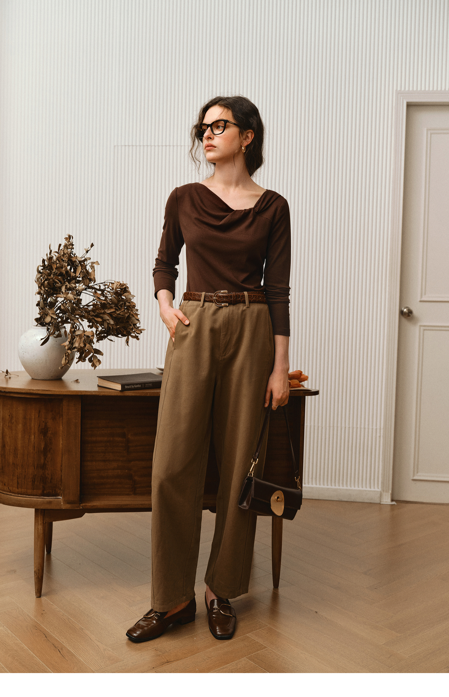 OLrain欧芮儿2025新款女秋季法式咖色设计感扭结领T恤长袖上衣