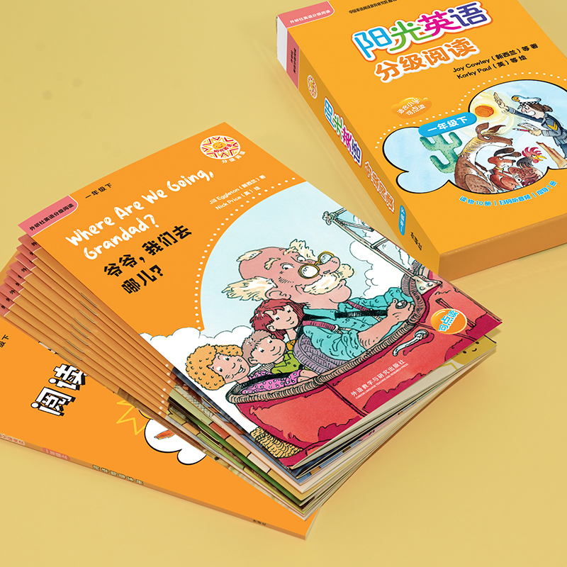 《阳光英语分级阅读一年级下》盒装内含10本英文读物:《瞧,我都能读出来》《大大小小》《追追追!》《斑点世界》《一起游泳吧!》《蜘蛛,蜘蛛》《我的花园有“怪兽”》《小狗臭臭》《暴风雨来了》《爷爷,我们去哪儿?》以及一本配套的《阅读指导手册》。10本英文读物从孩子的日常生活视角出发,帮助孩子建立对世界的认知,同时获得积极正向的情感体验。故事类读物通过简单的小情节,激发了孩子的共鸣,其中《瞧,我都能读出来》讲述了小朋友在各种家庭物品和生活环境中识字的乐趣,不仅激发了孩子的观察兴趣和生活情趣,同时也引发了孩子的阅读共鸣;《小狗臭臭》培养了孩子亲近自然、爱护动物的意识。百科类读物完全基于孩子的视角,在讲述百科知识的同时培养了孩子探索自然的好奇心和想象力。其中《我的花园有“怪兽”》通过从特写到全景的展示手法,聚焦不同动物的身体部位,培养了孩子对比的思维方式;而《暴风雨来了》在描写了风雨雷电的天气之后,更启示了孩子对大自然的敬畏之心。套装内10本英文读物均可点读,扫描单书封底可扫码听音频,适合小学一年级学生阅读与学习。