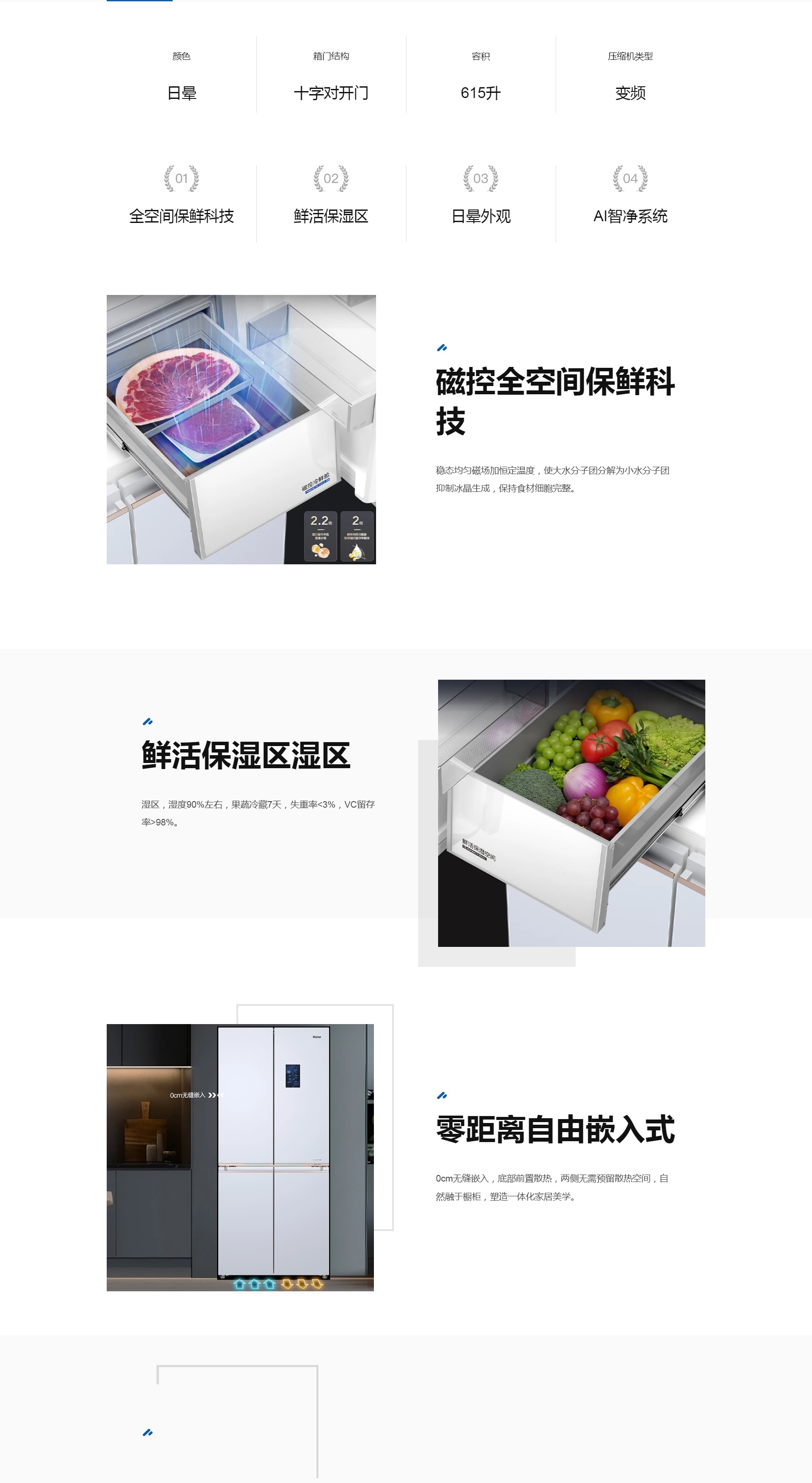 海尔 冰箱 BCD-615WGHTD2IS4U1 615升 十字对开门 风冷 变频 一级能效 零距离自由嵌入式 AI智净系统 日晕颜色 钢化玻璃面板 电脑控温 触摸操控