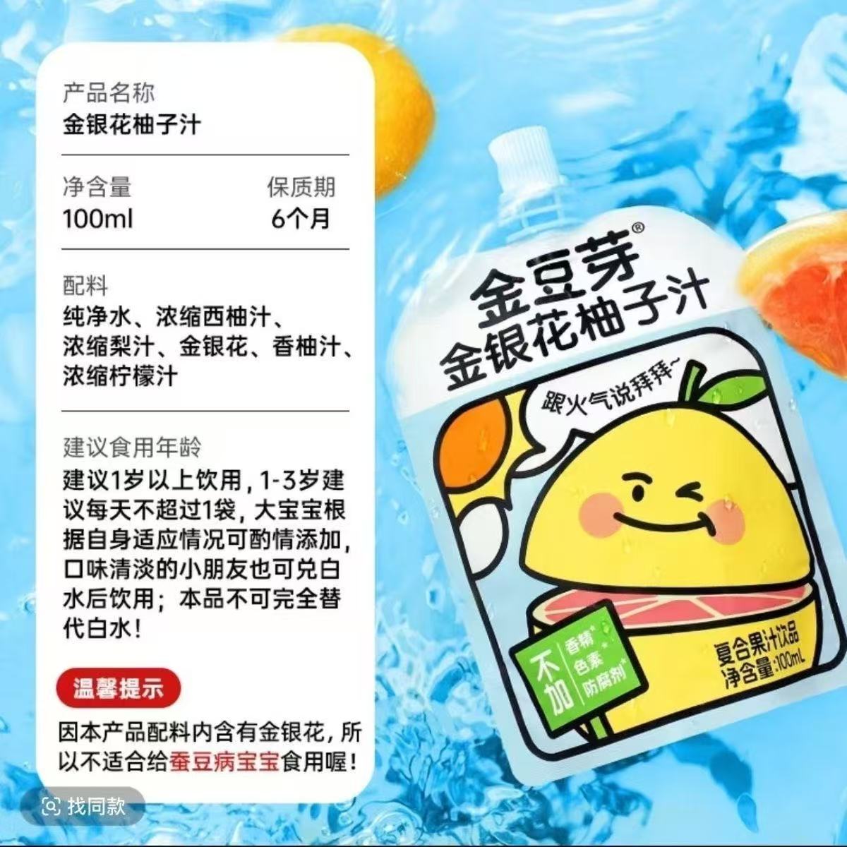 金豆芽 金银花柚子汁/山楂汁 100ml*15袋(26.3月到期)