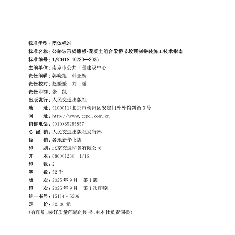 书名:公路波形钢腹板-混凝土组合梁桥节段预制拼装施工技术指南(T/CHTS 10220—2025)