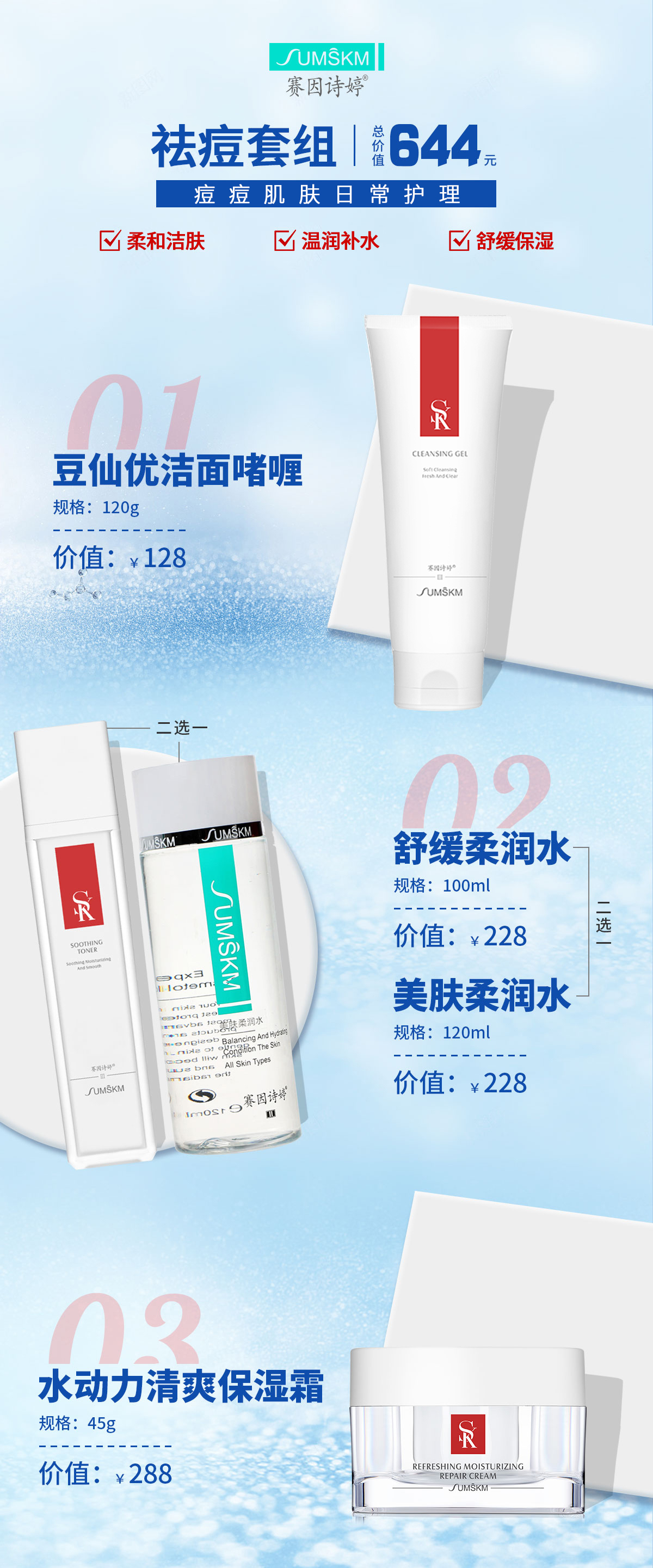 【会员专享】祛痘套组-赛因诗婷洗面奶+柔肤水+面霜 柔和洁肤舒缓保湿