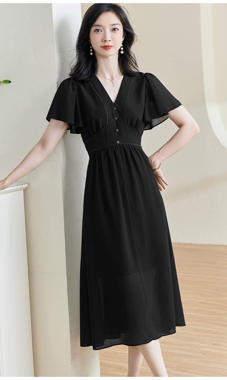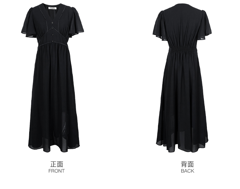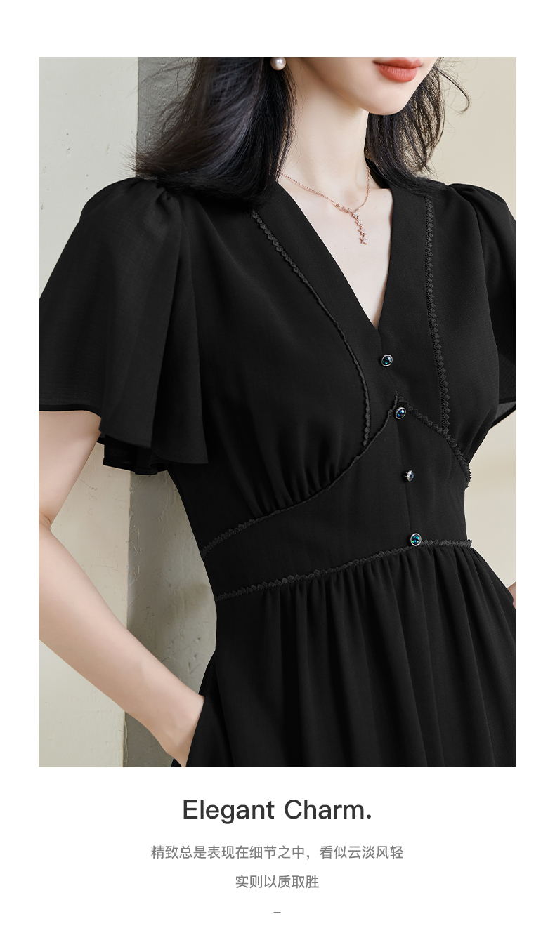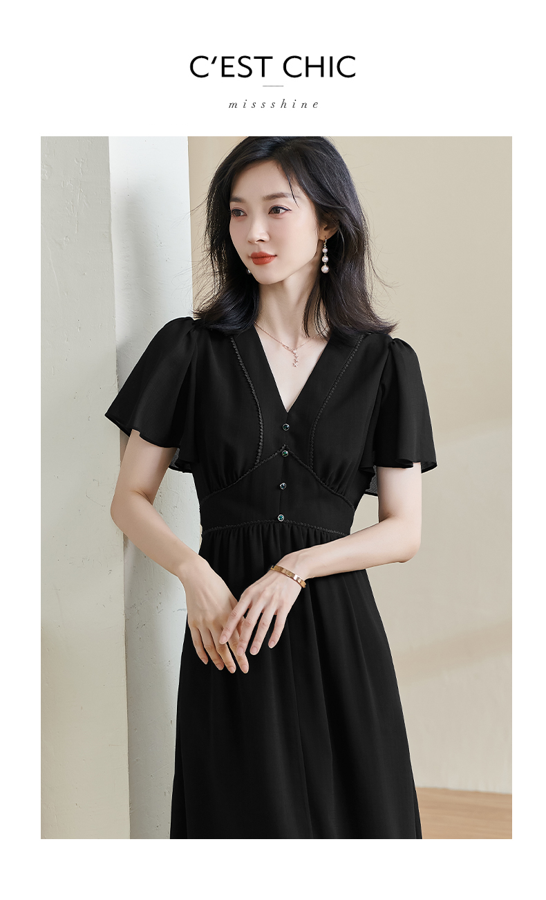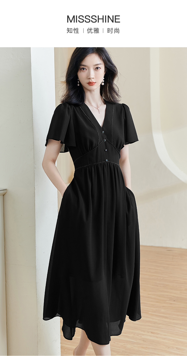 剩S 【现货】米思阳2025夏季新款气质优雅收腰显瘦黑色大摆裙飞飞袖连衣裙1689