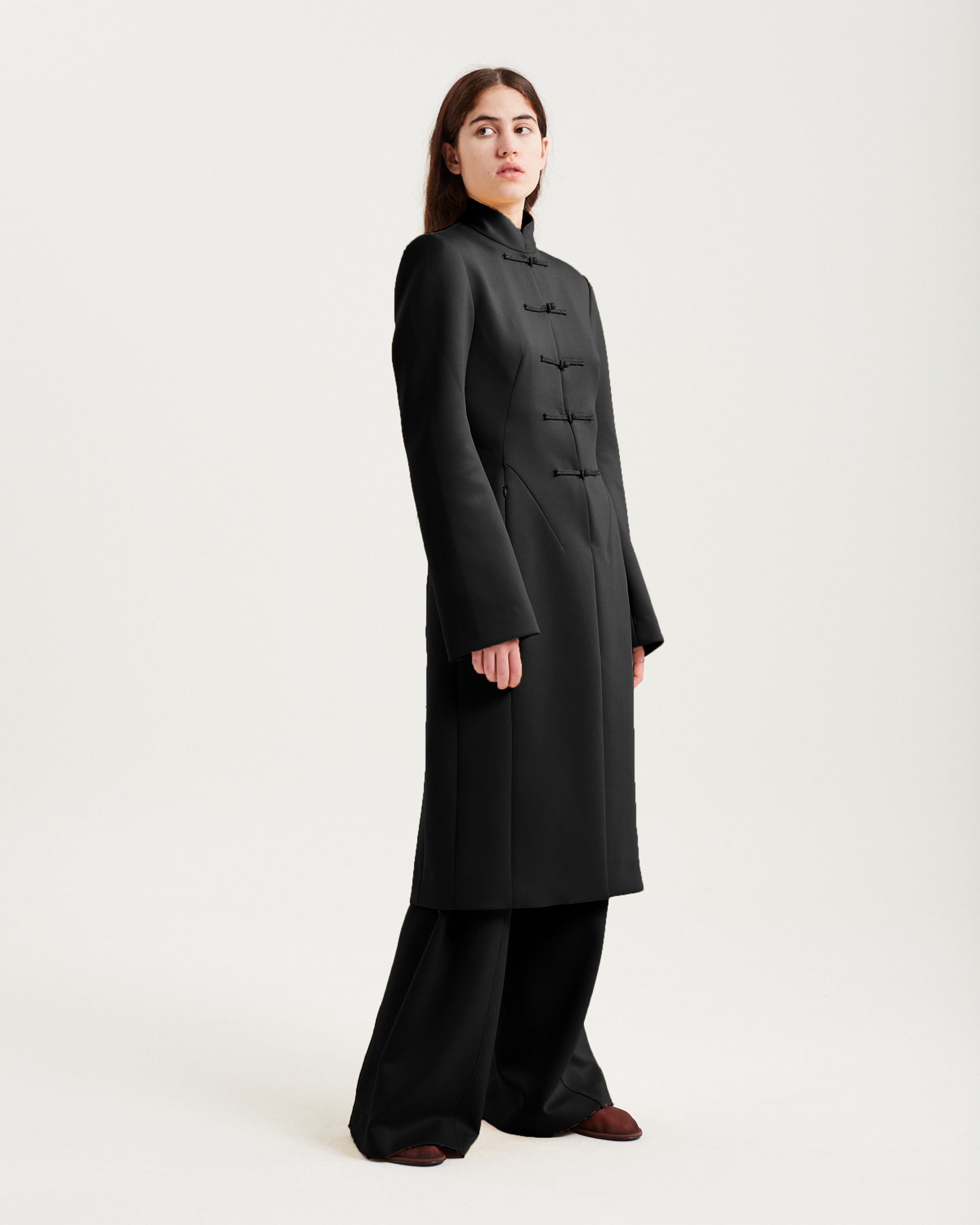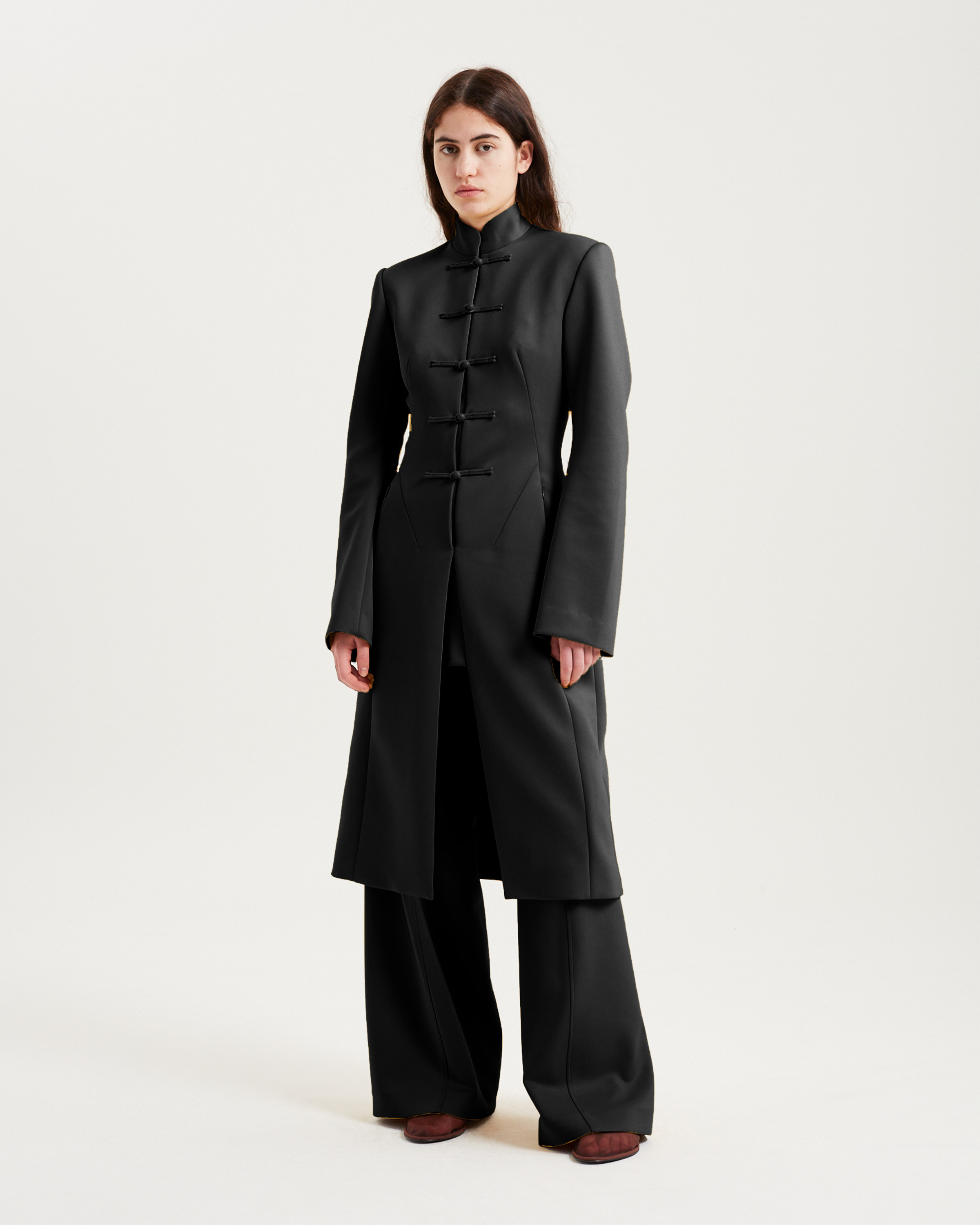 Lee Coat与我们上一季的 Lee Coat相同,但使用了新的配色。廓形方面,标志性的沙漏造型,衣摆往下延伸至中长的外套。