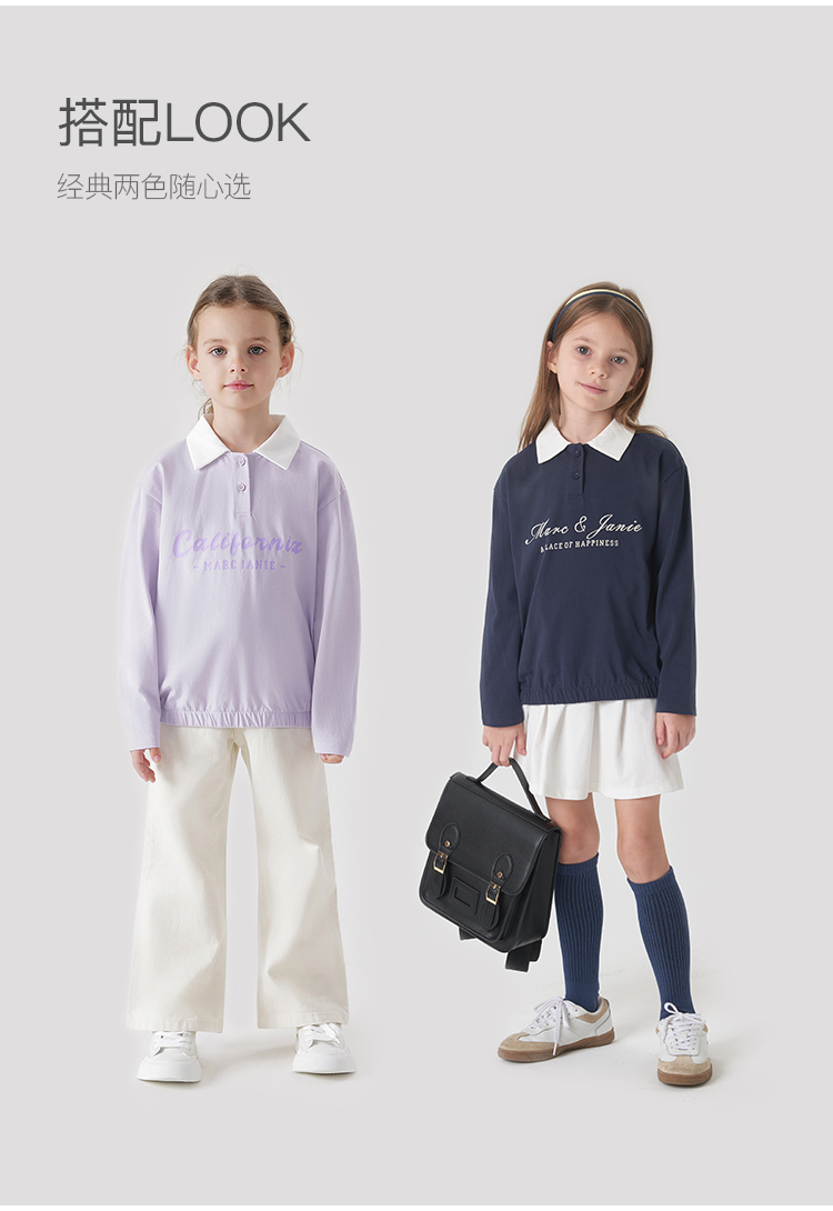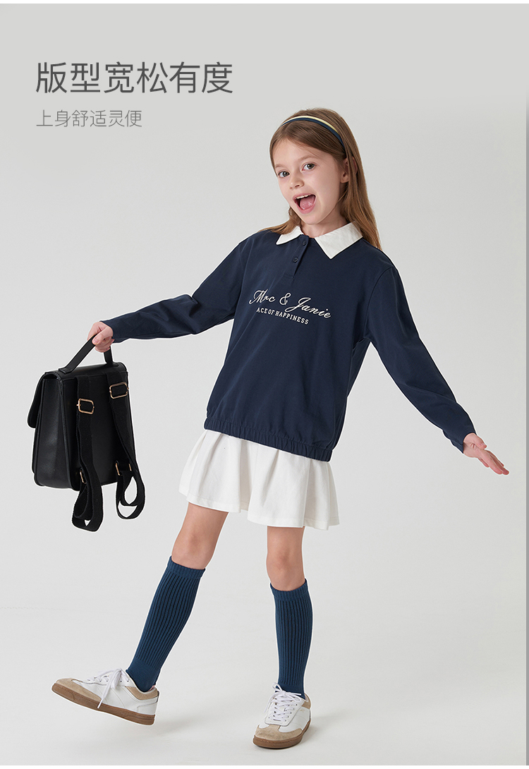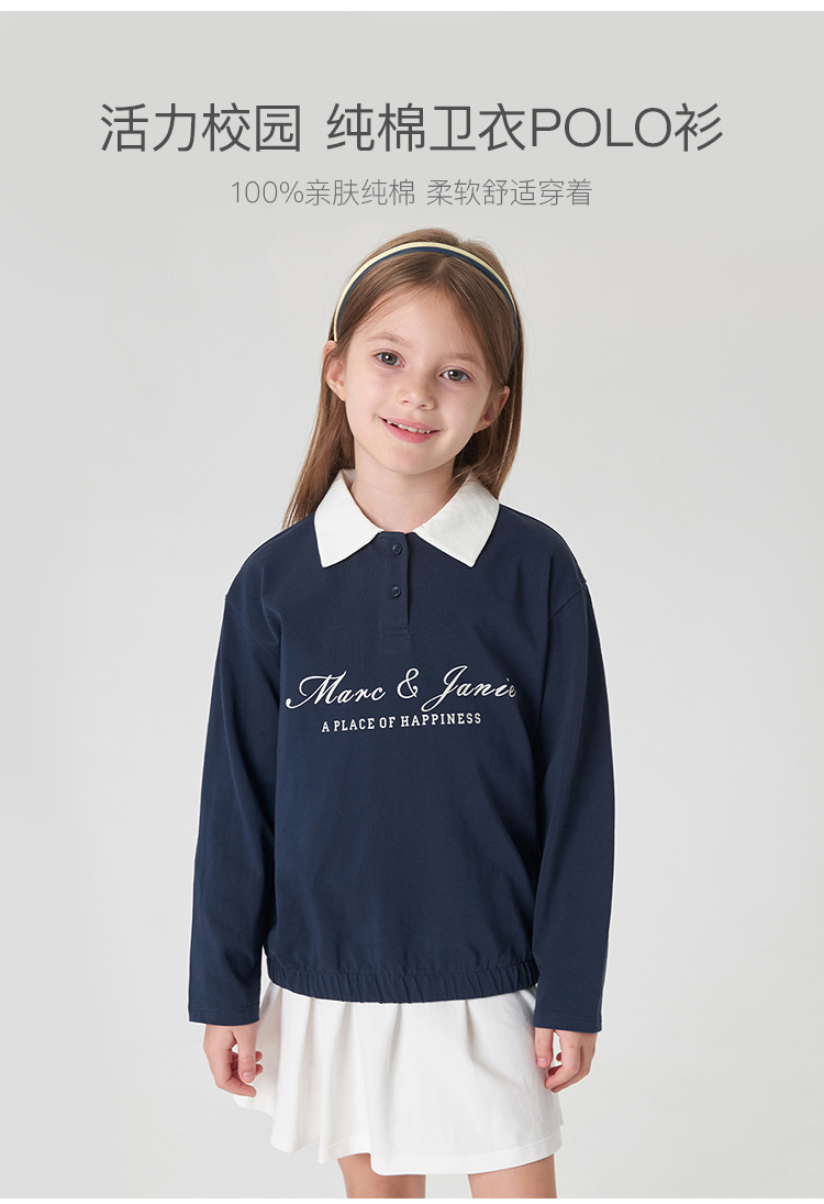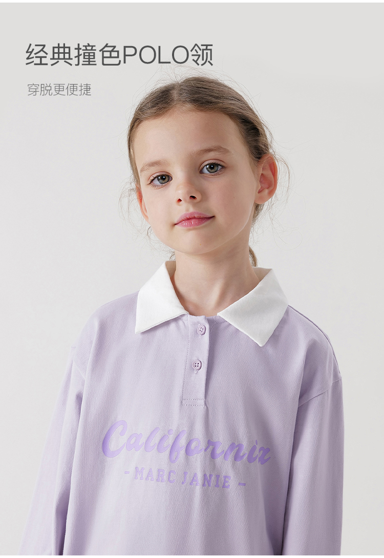马克珍妮女童学院风polo领T恤 儿童纯棉撞色长袖上衣春款240235