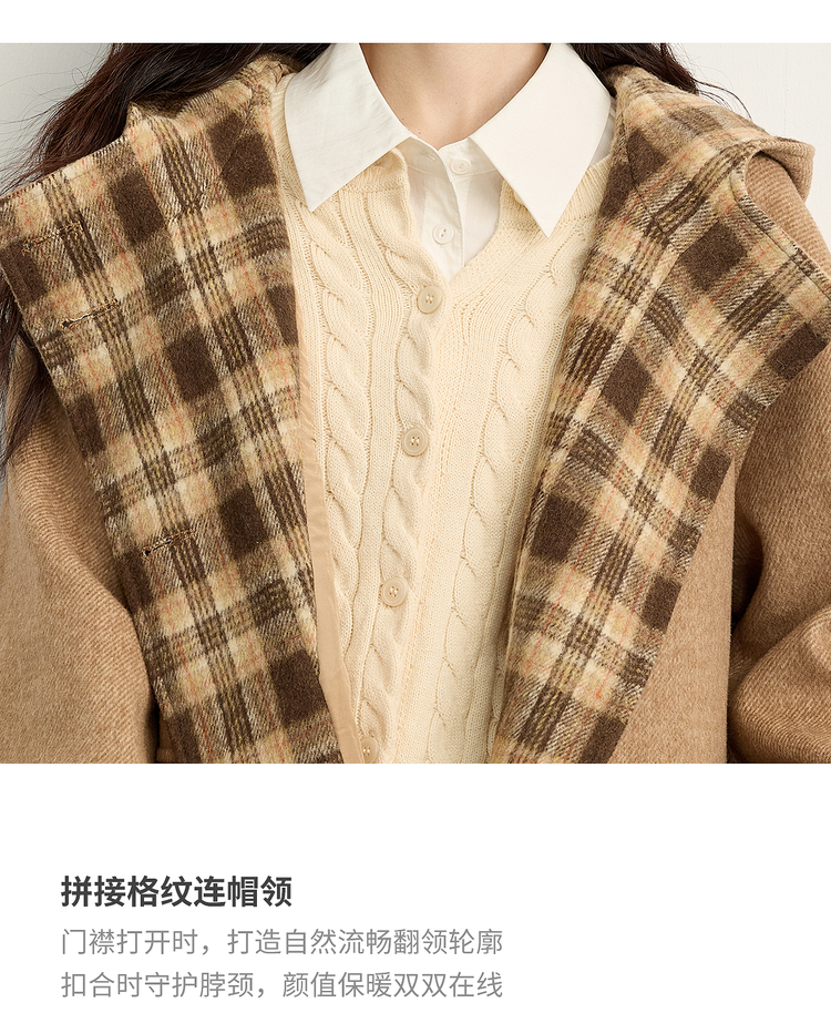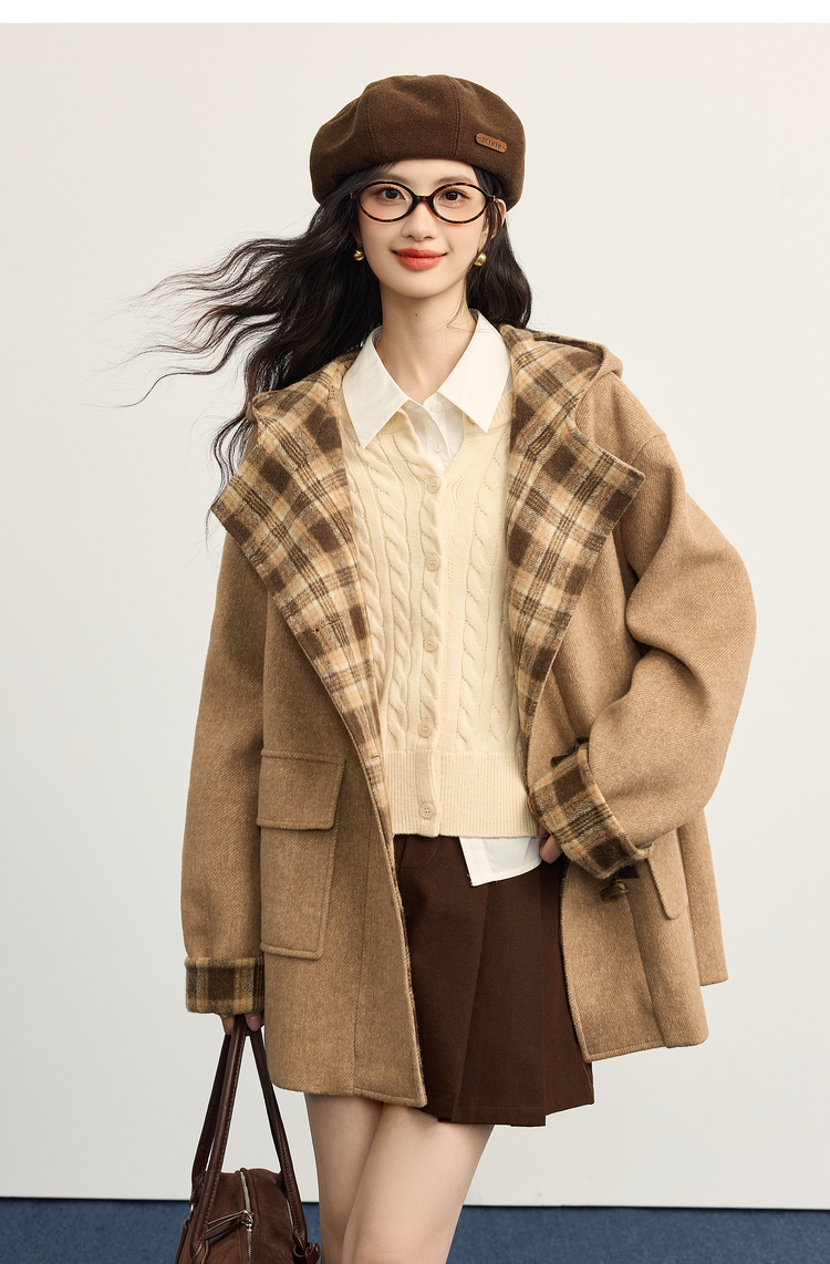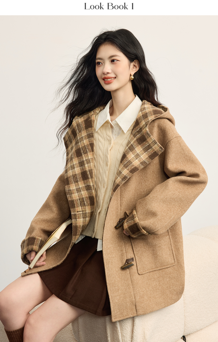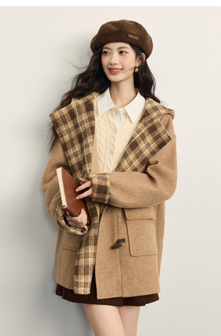 【11/26新品】熙世界绵羊毛撞色格纹毛呢大衣女短款牛角扣连帽外套2025冬季新款