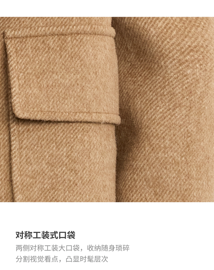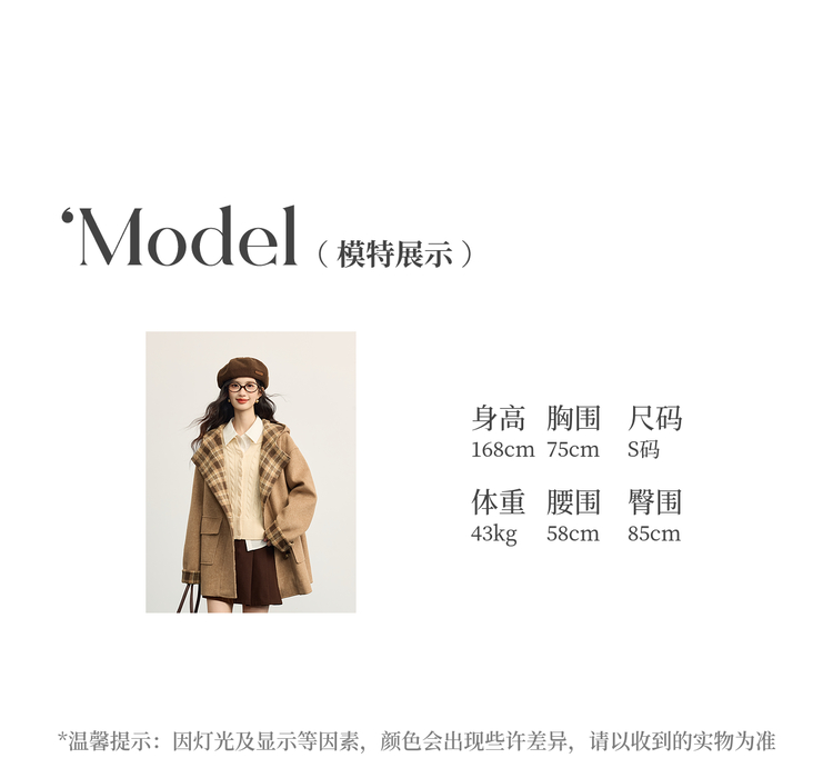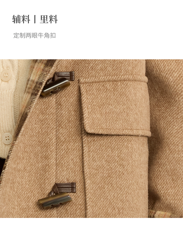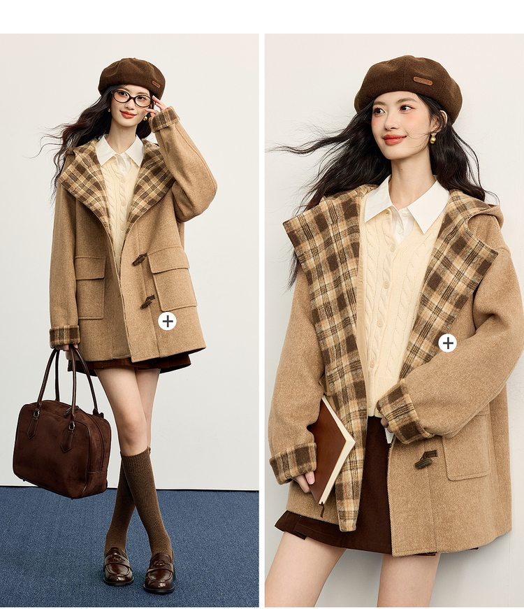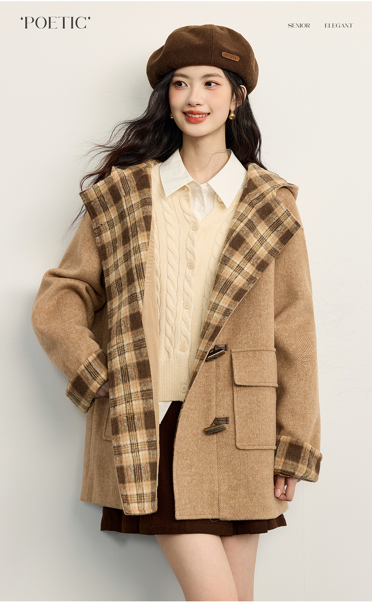 【11/26新品】熙世界绵羊毛撞色格纹毛呢大衣女短款牛角扣连帽外套2025冬季新款