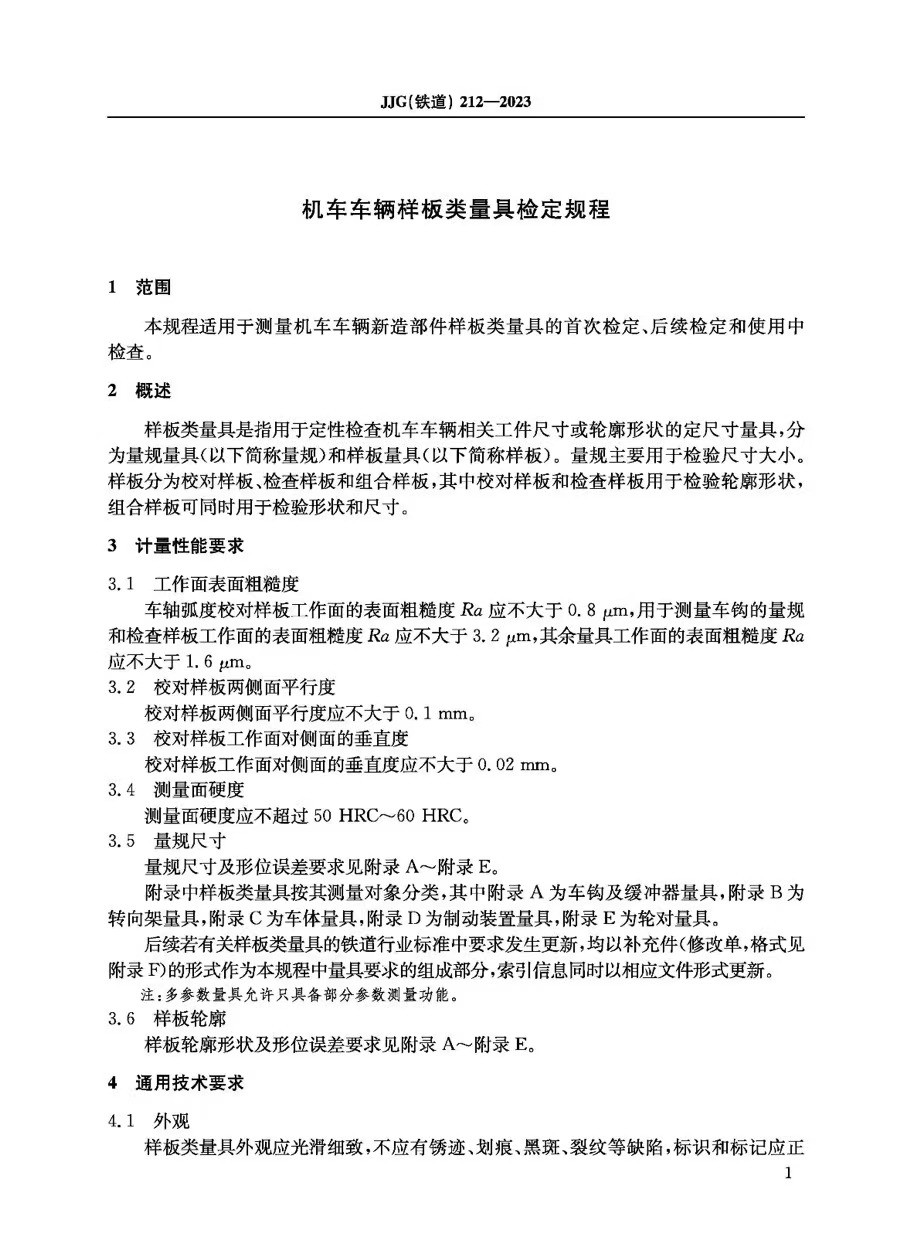 本规程为国家铁路局发布的铁道部门计量检定规程,2023年第一批检定规程规范3种(共3种),规程的名称为《机车车辆样板类量具》,代替标准JJG(铁道)106—2001、JJG(铁道)107—2015、JJG(铁道)153.4—2009等。本规程主要从机车车辆样板类量具的范围、概述、计量性能要求、通用技术要求、计量器具控制等方面进行了介绍。本规程适用于测量机车车辆新造部件样板类量具的首次检定、后续检定和适用中检查。