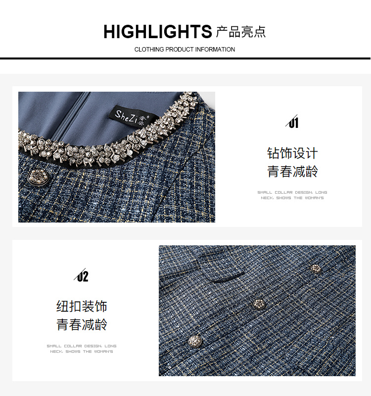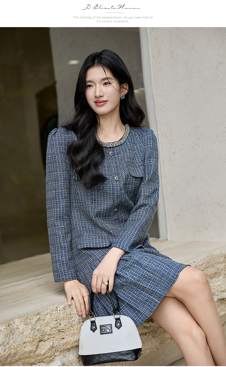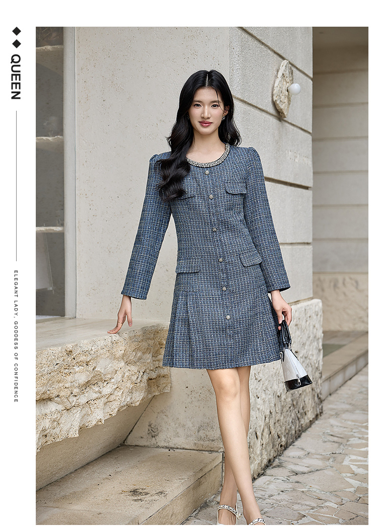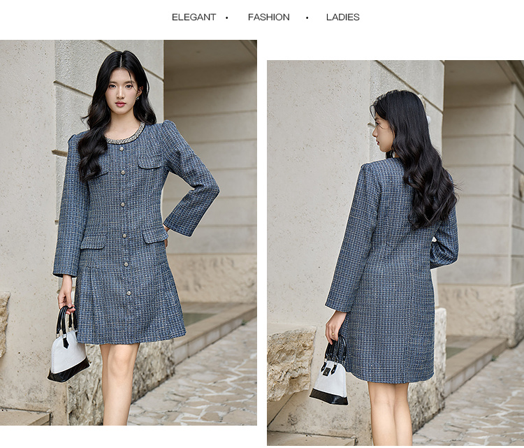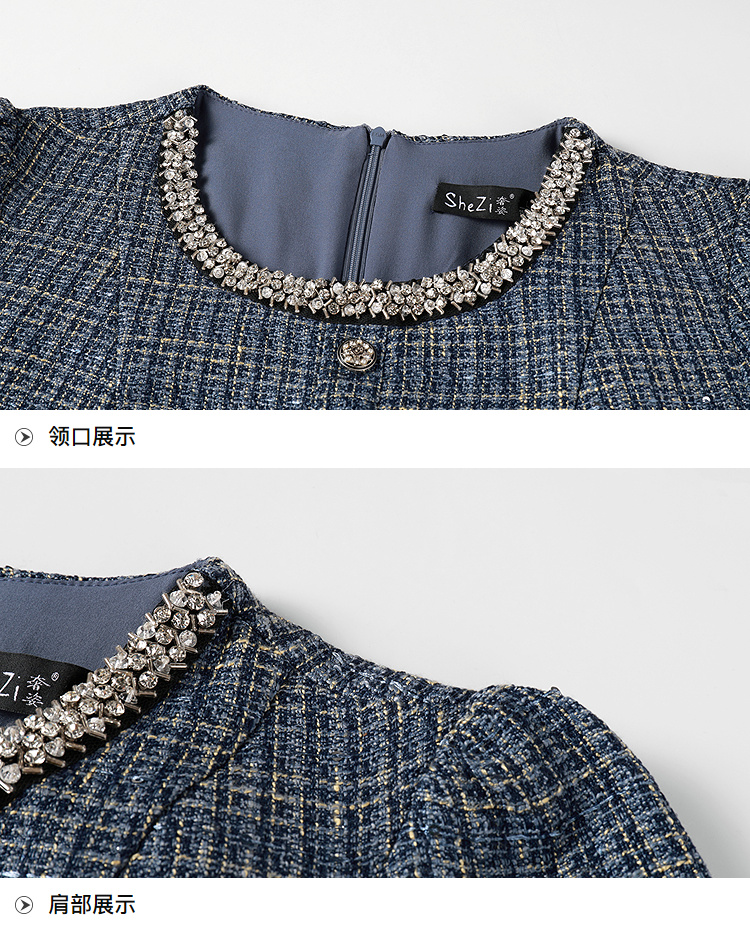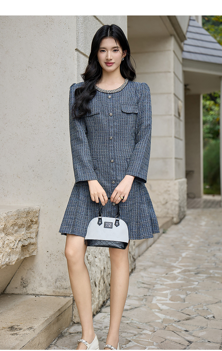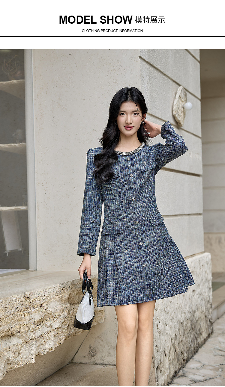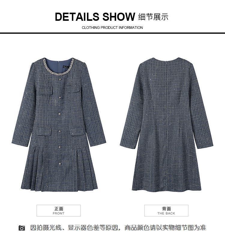 奢姿大码女装2026冬季胖妹妹蓝色气质名媛小香风钉珠连衣裙百褶裙9954853783