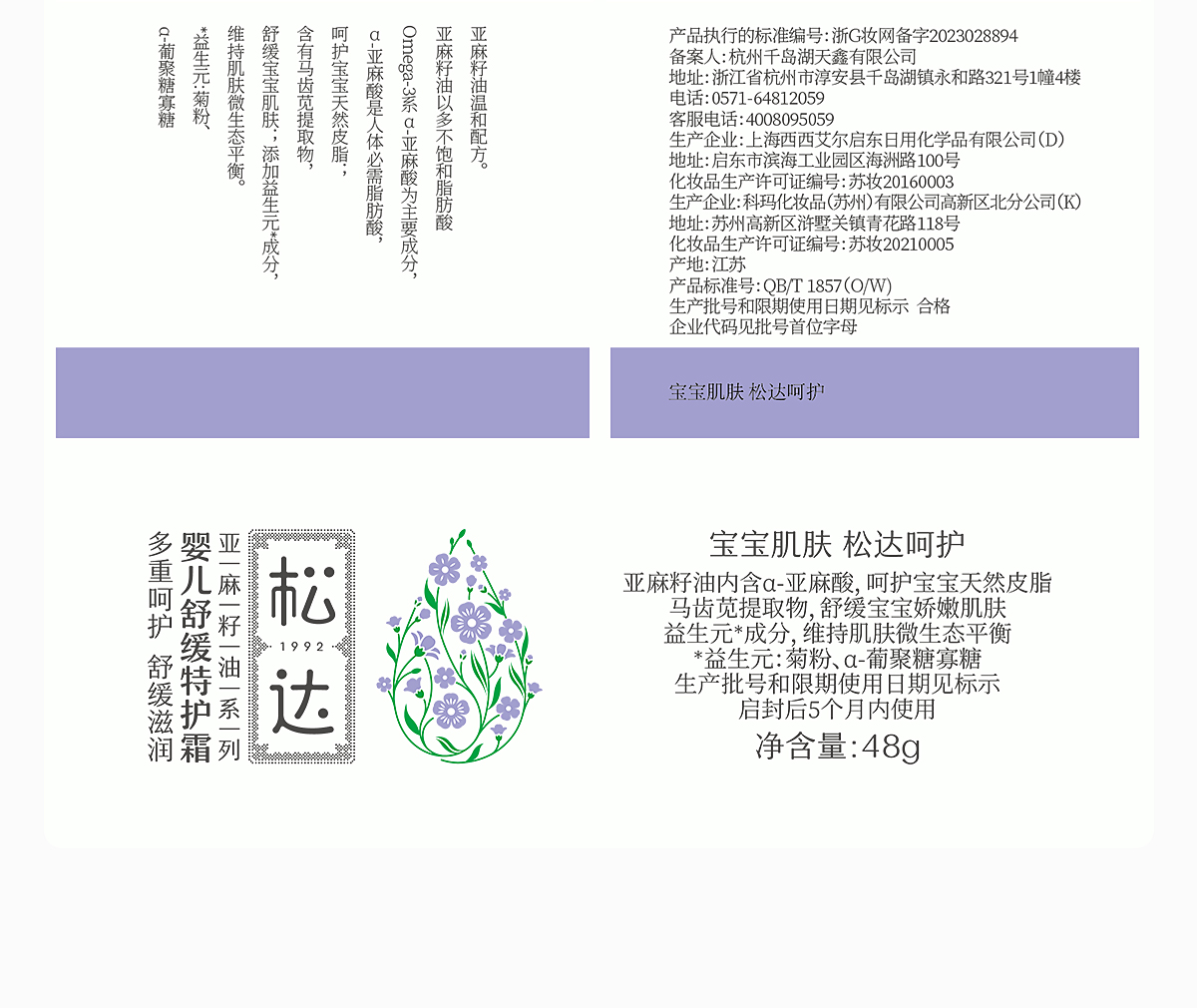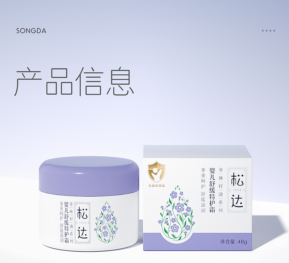 松达婴儿亚麻籽油宝宝舒缓保湿特护霜儿童面霜口水润肤膏滋润补水48g