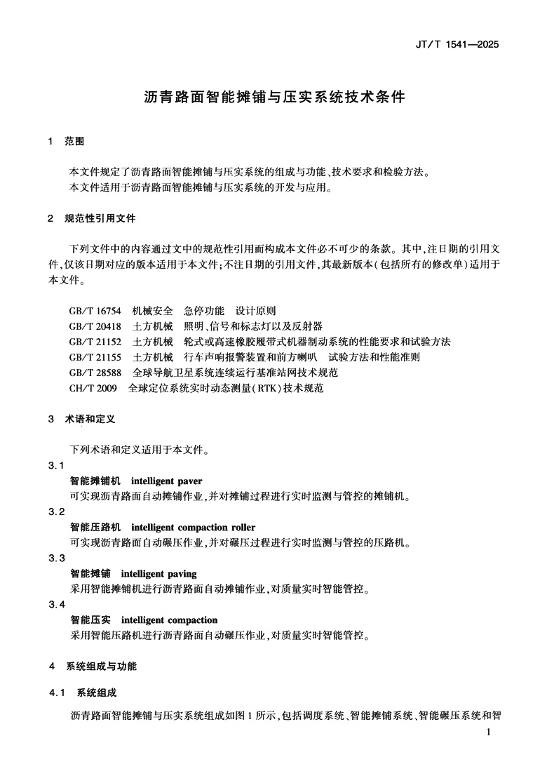 沥青路面智能摊铺与压实系统技术条件(JT/T 1541—2025)