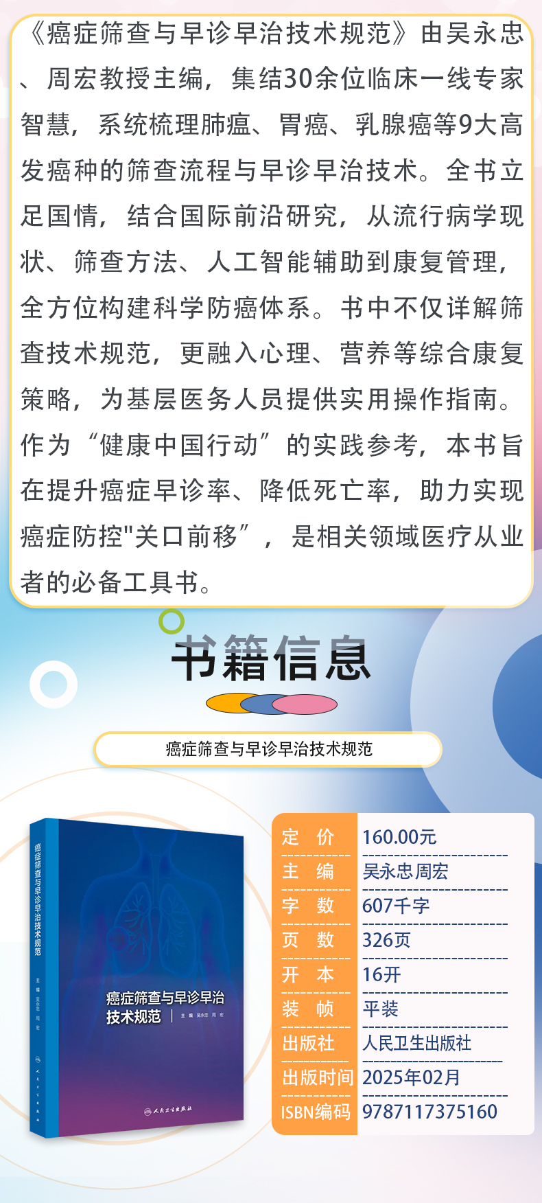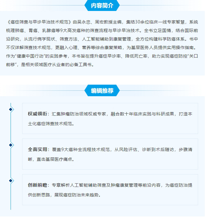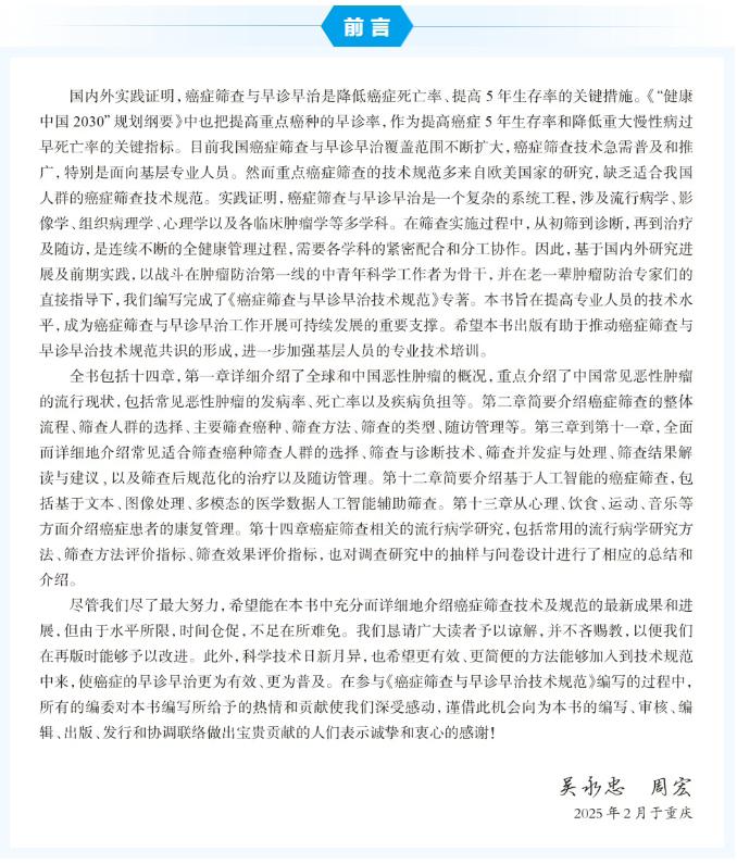 癌症筛查与早诊早治技术规范 吴永忠 周宏主编 系统梳理肺癌胃癌乳腺癌等9大高发癌种的筛查流程与早诊早治技术 人民卫生出版社