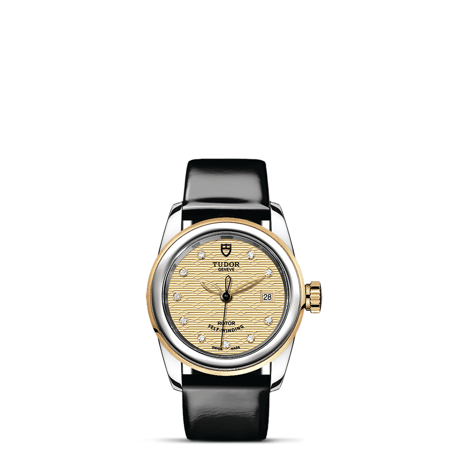 旋入式上链錶冠,饰以帝舵表标志;精钢覆有0.1毫米18K黄金薄层