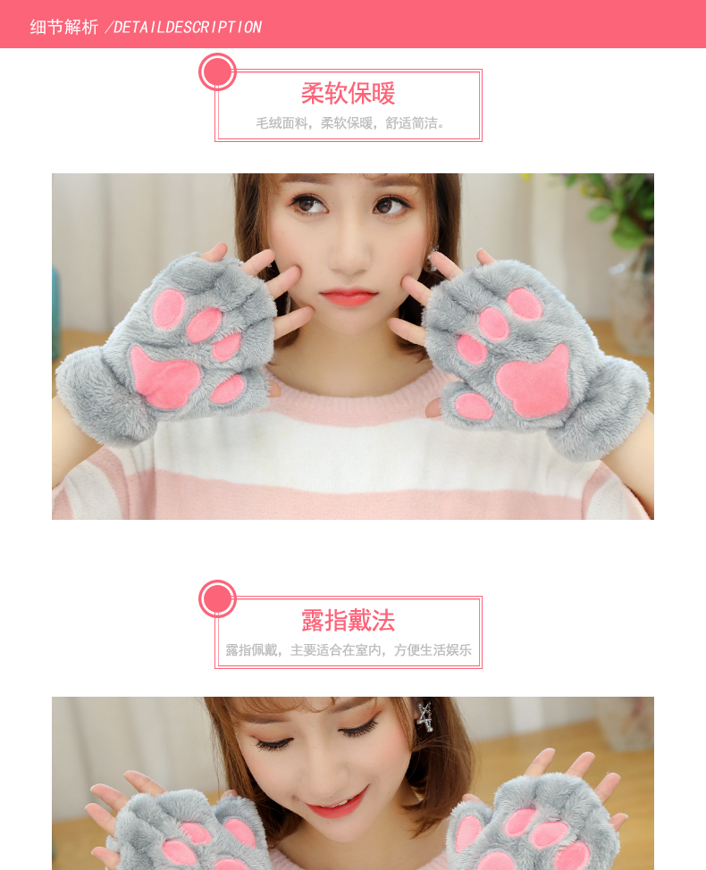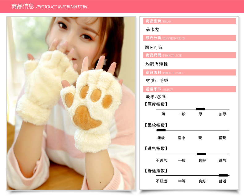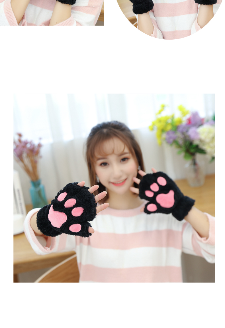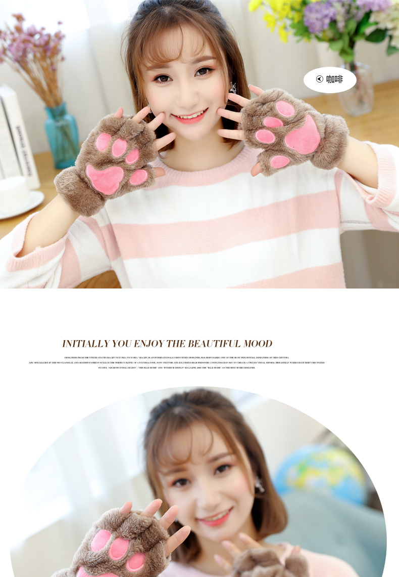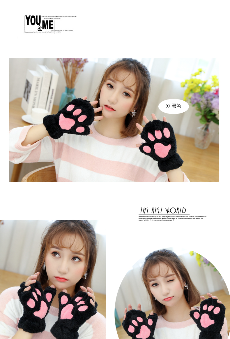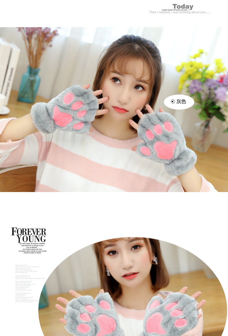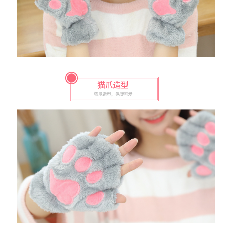 【卡通猫爪手套】男女加绒加厚半指手套保暖猫爪露指毛绒学生儿童居家日用