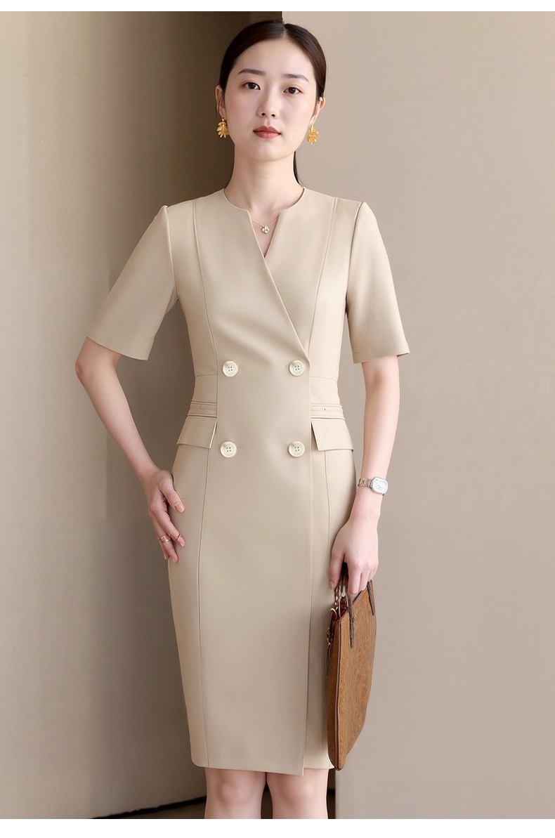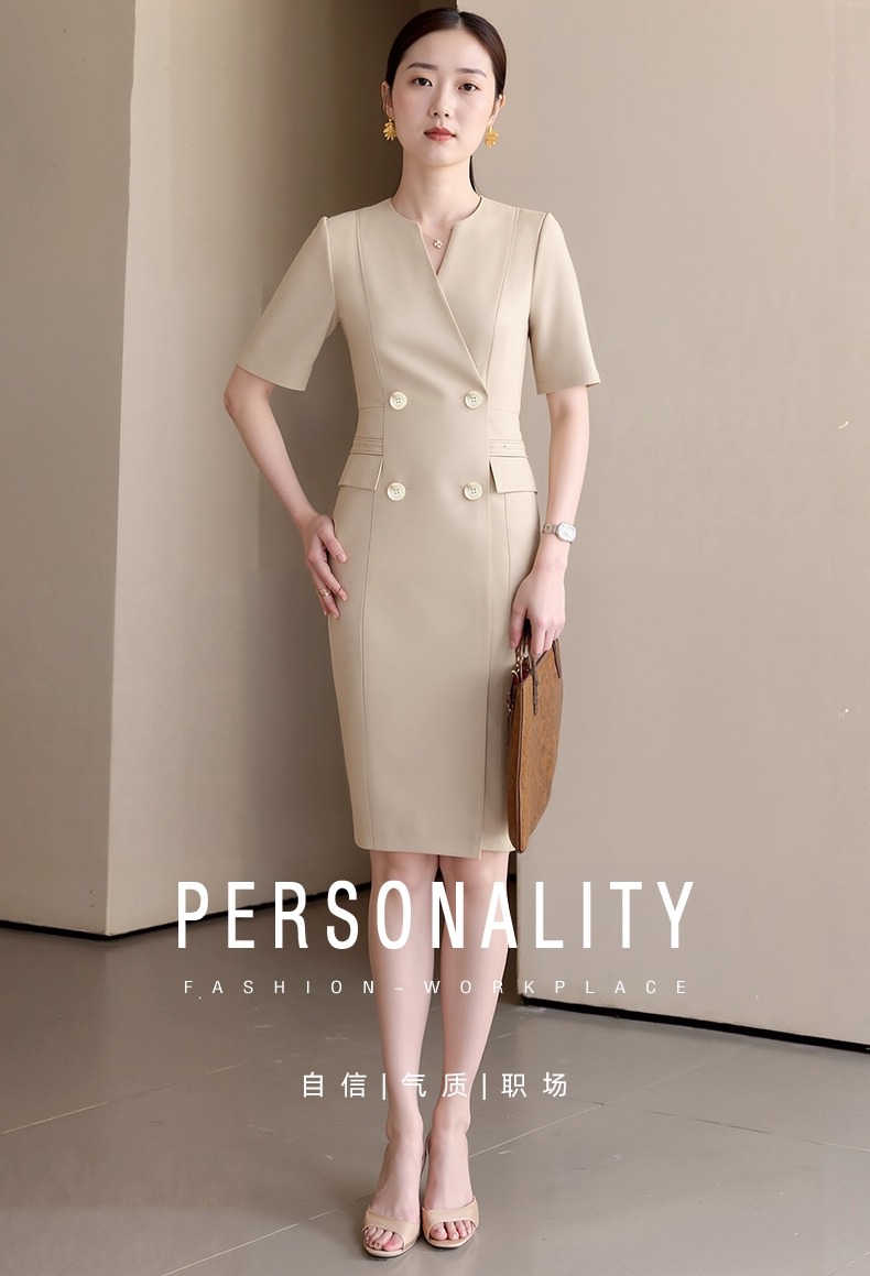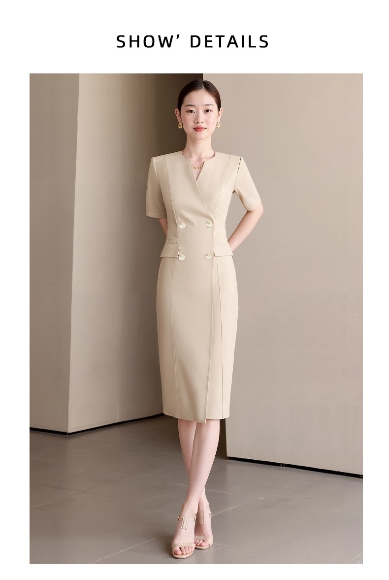 IWY/纸片人通勤装_高级感卡其色双排扣西装连衣裙夏季职业装WQ179