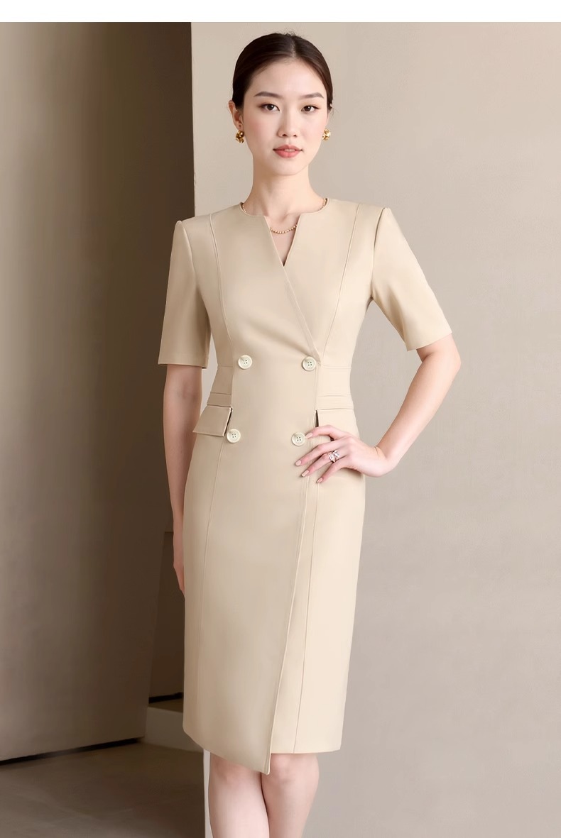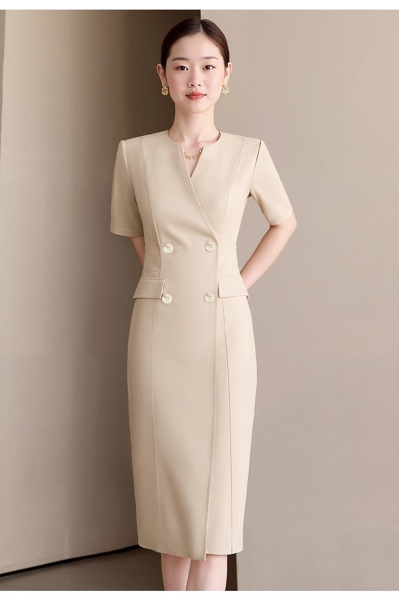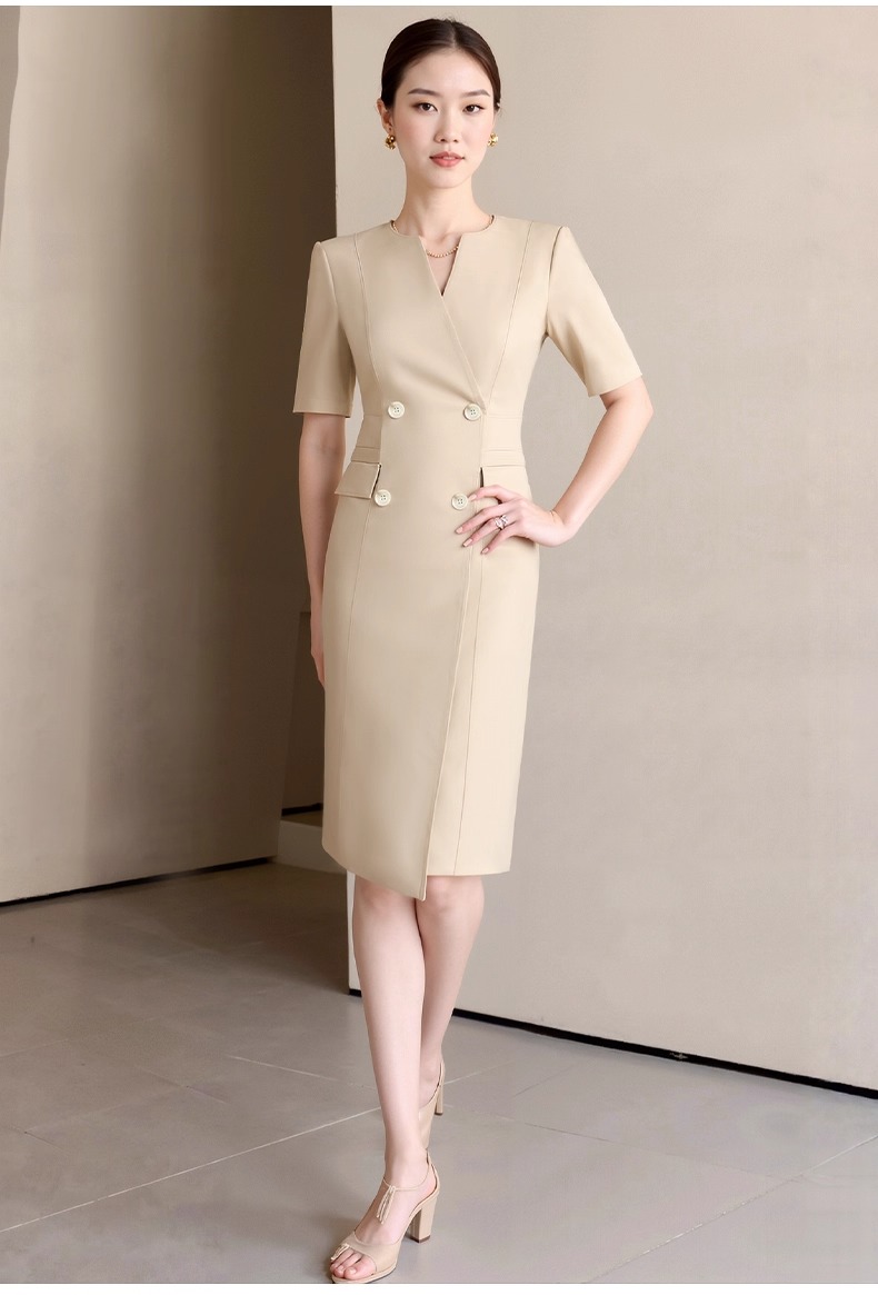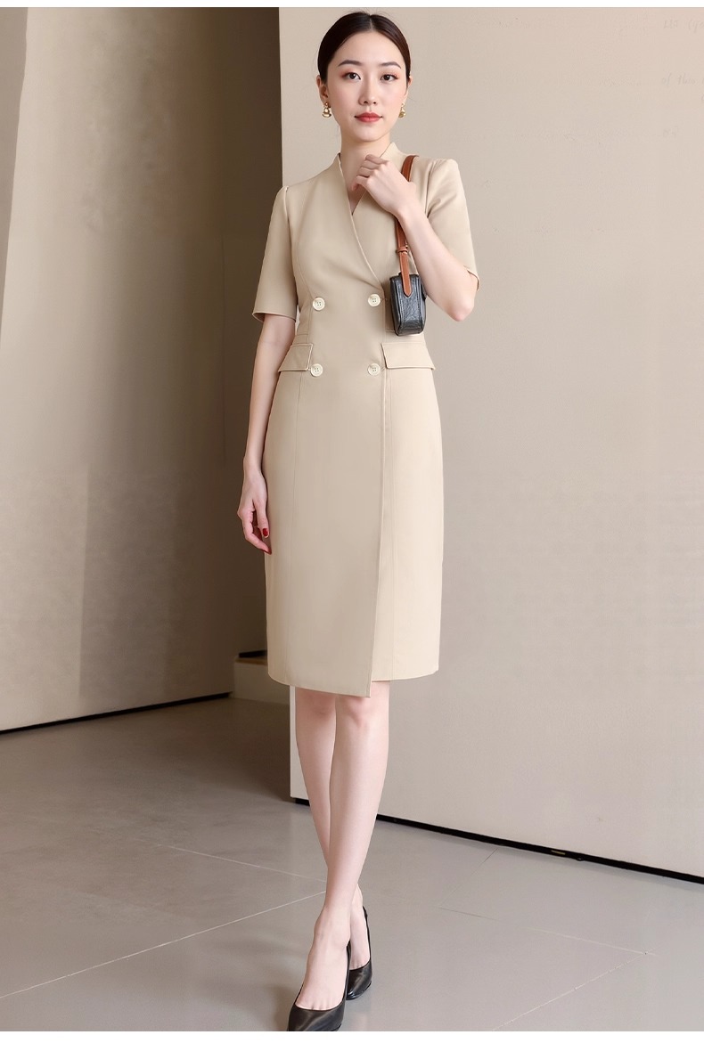 IWY/纸片人通勤装_高级感卡其色双排扣西装连衣裙夏季职业装WQ179