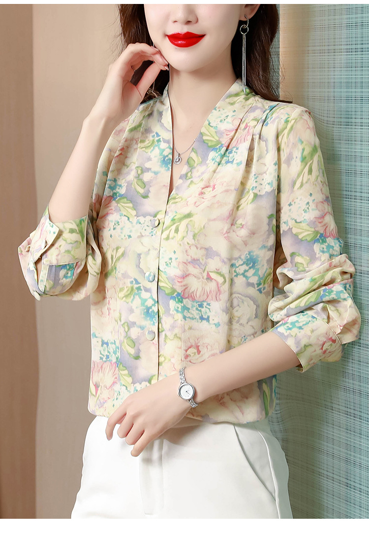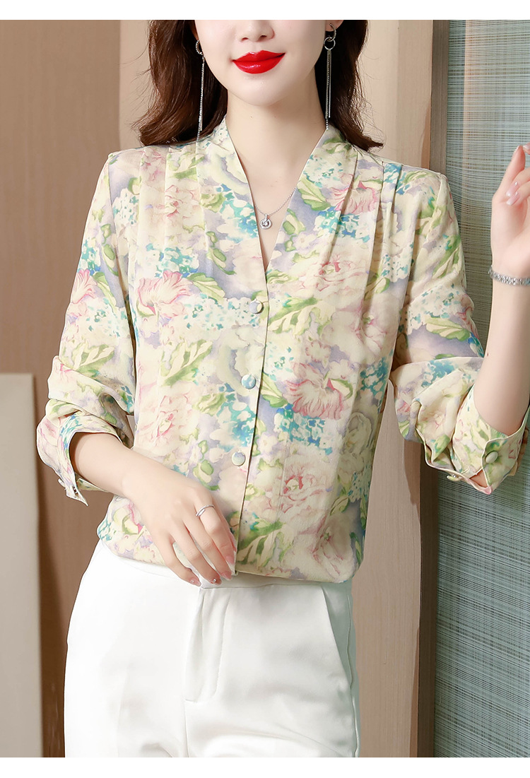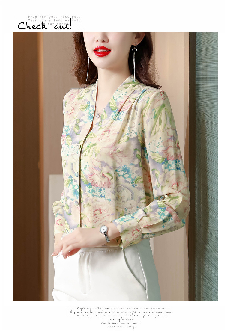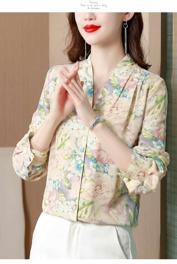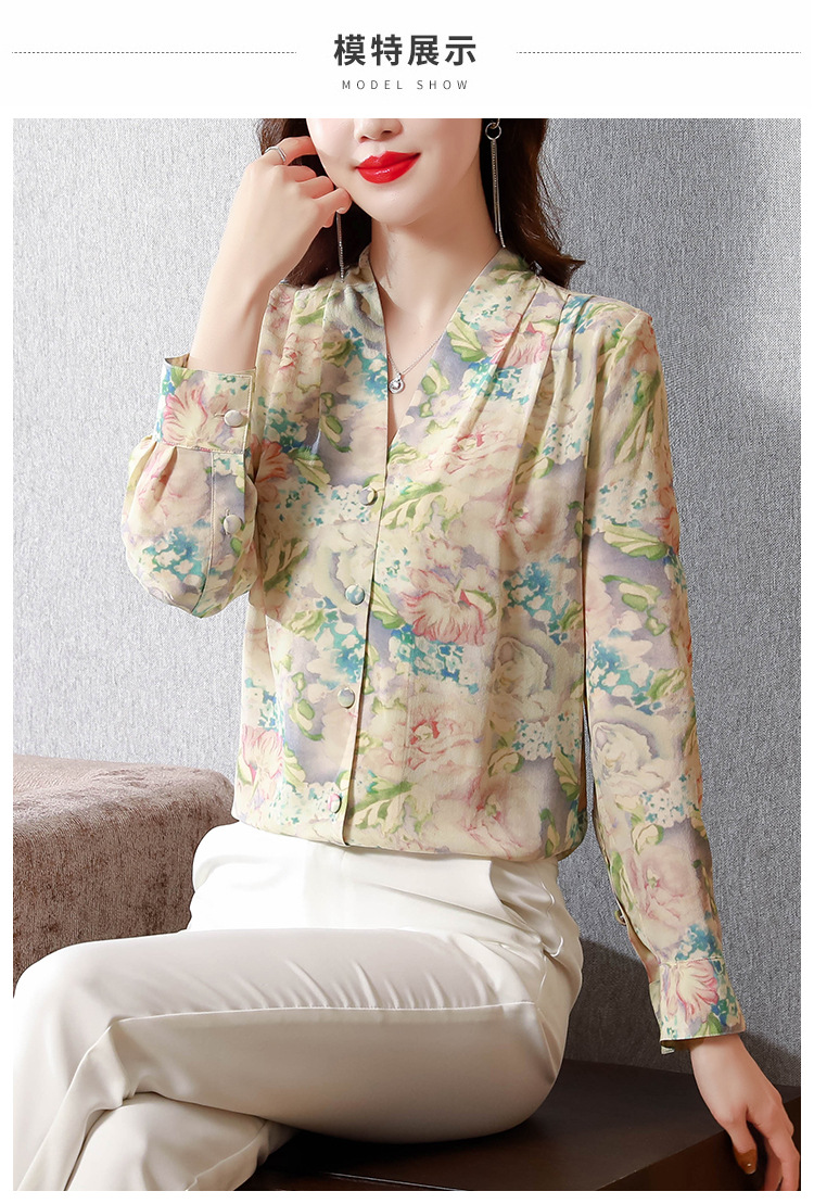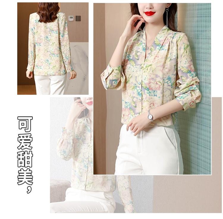 仿真丝衬衫女宽松2022春装新款女装春立体印花气质V领上衣 KQL8152