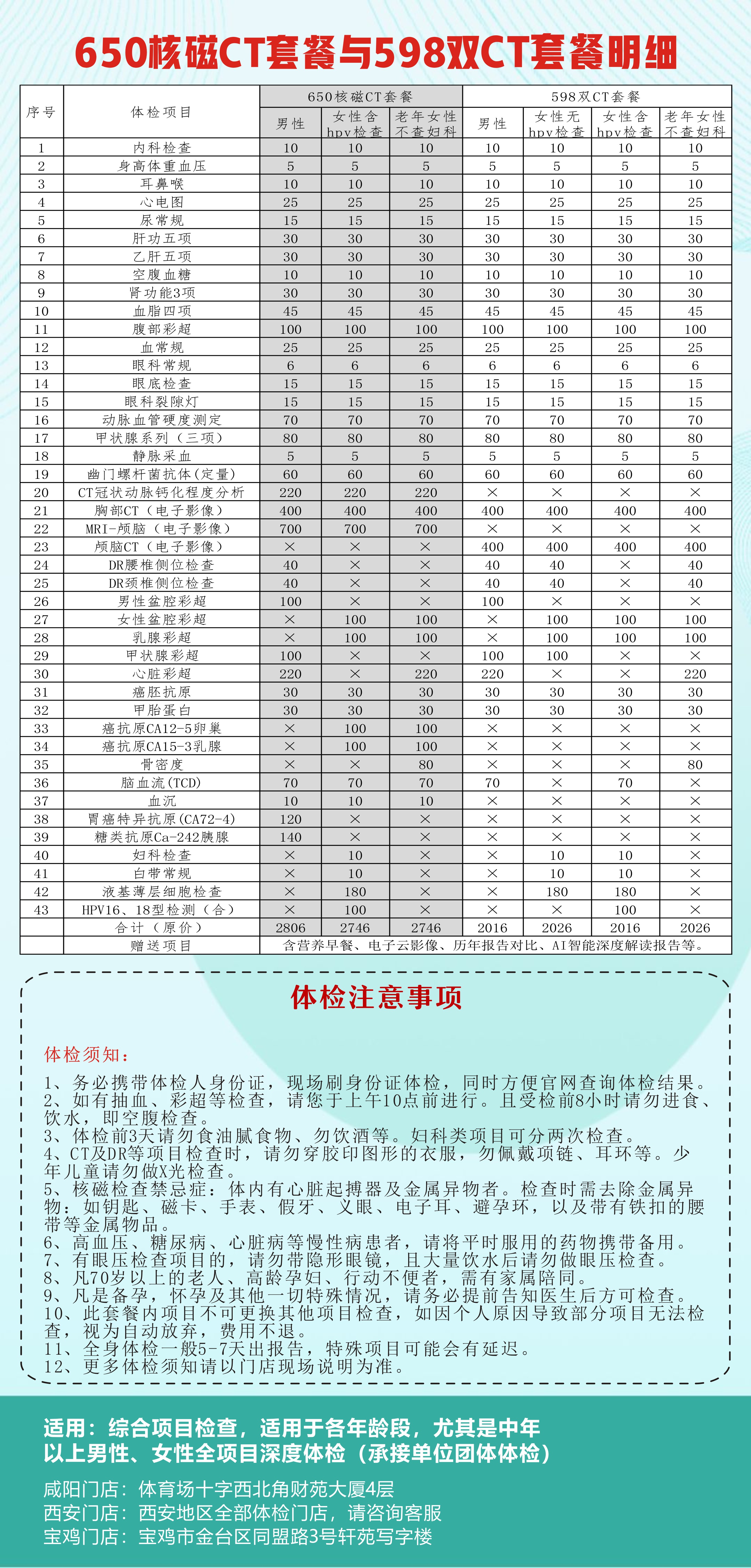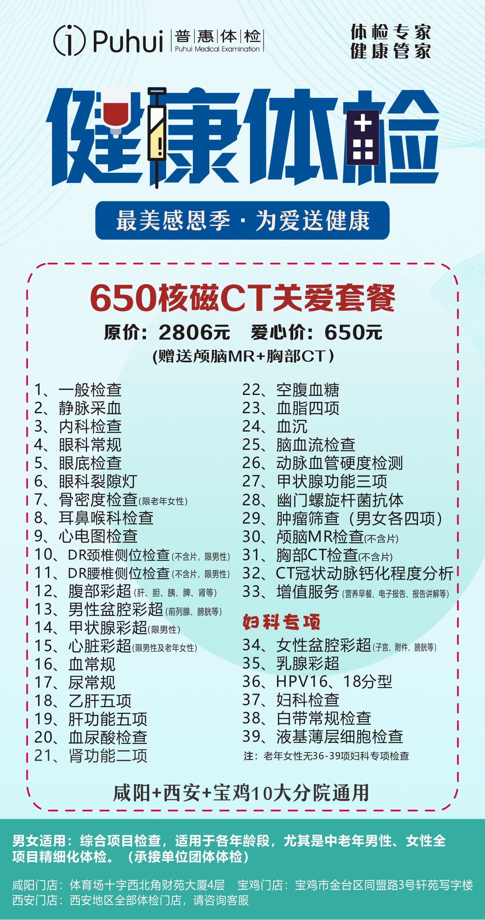 【男女599核磁CT套餐最高43项】普惠体检最高2806元贵宾体检套餐(咸阳+西安+宝鸡可用)