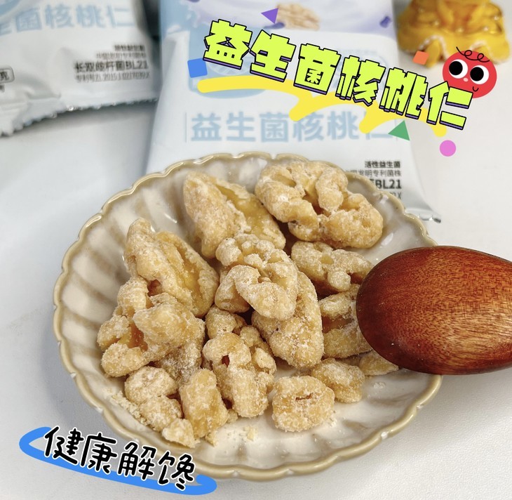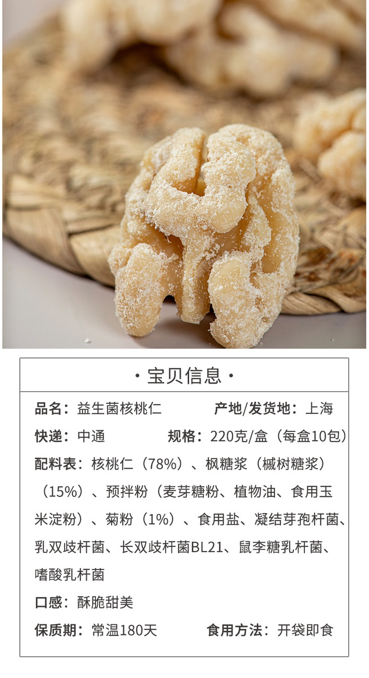【益生菌核桃仁】个大饱满,果仁完整,香香脆脆,一口一个嘎嘣脆!外表裹着一层活性益生菌和加拿大枫糖浆,吃起来一点也不苦涩,早餐来俩个很合适哦~