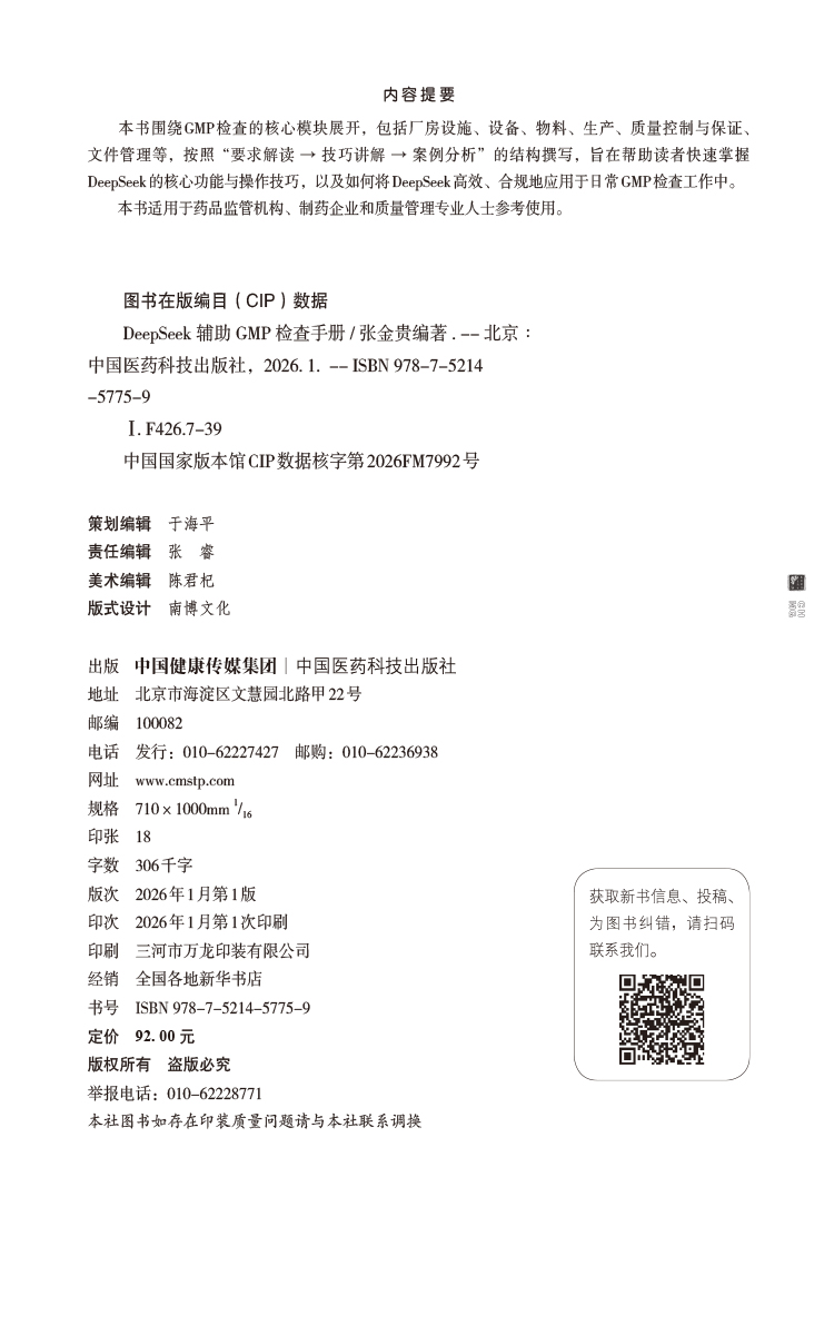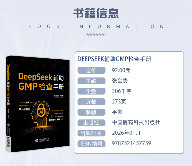 DeepSeek辅助GMP检查手册 张金贵 本书围绕GMP检查的核心模块展开 包括厂房设施 设备 物料 质量控制与保证等 中国医药科技出版社