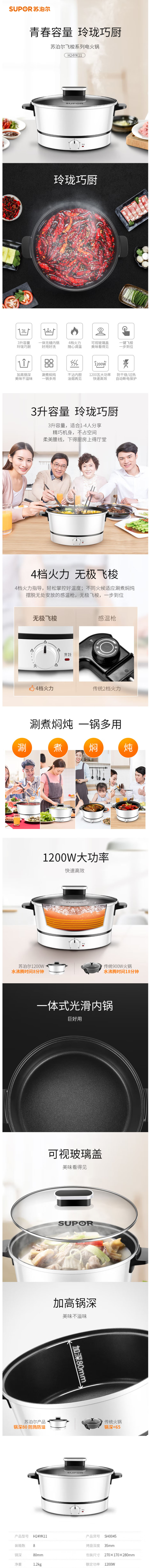 苏泊尔(SUPOR) 3L 多功能电火锅 四档火力调节 不沾内胆 1200W大火力 电火锅H24YK11