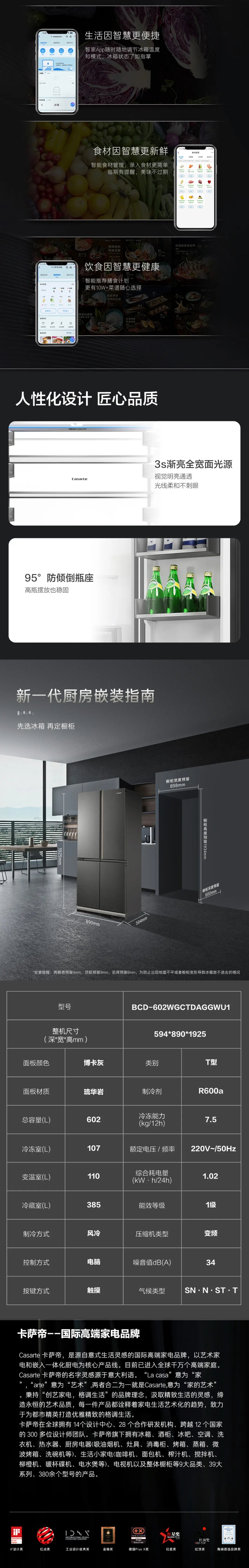 卡萨帝 致境T型602升冰箱 原创平嵌BCD-602WGCTDAGGWU1 智慧动态除菌净化| 底置循环风幕科技