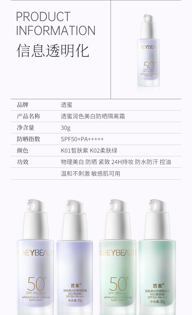 【蜜家特惠】透蜜润色美白防晒隔离霜30g SPF50+ PA++++ 精华级美白防晒隔离霜 99%纯度玻色因