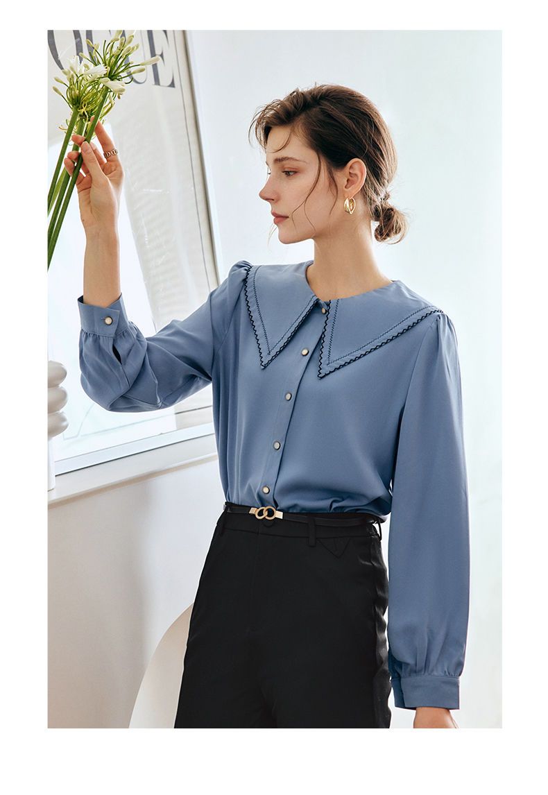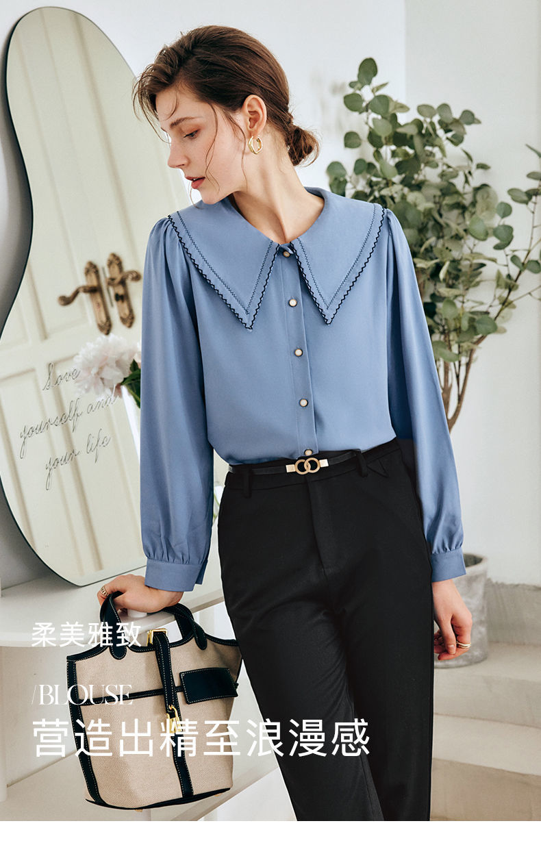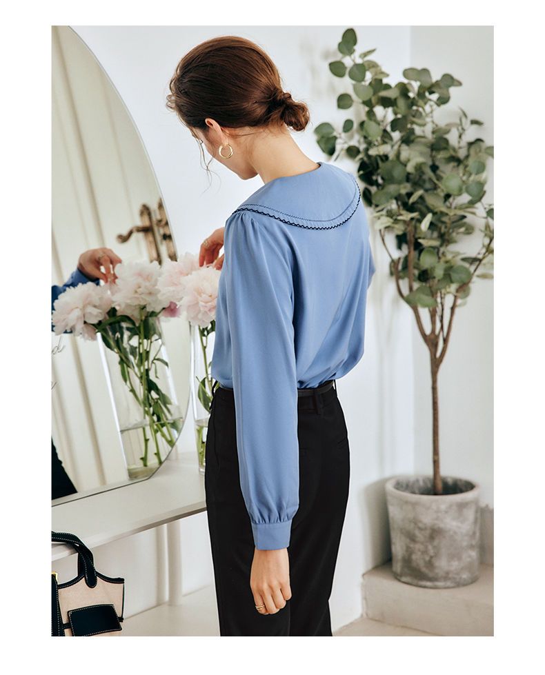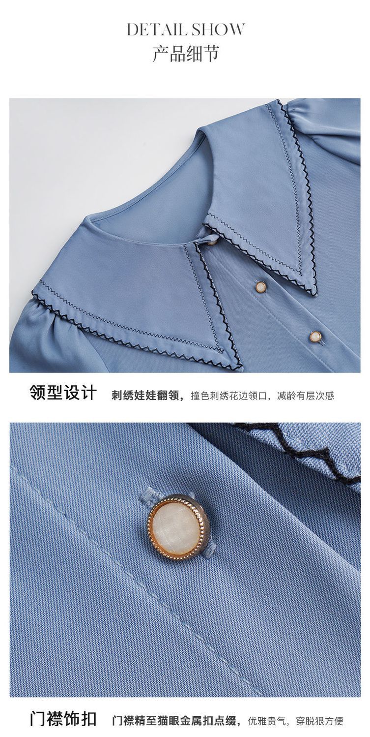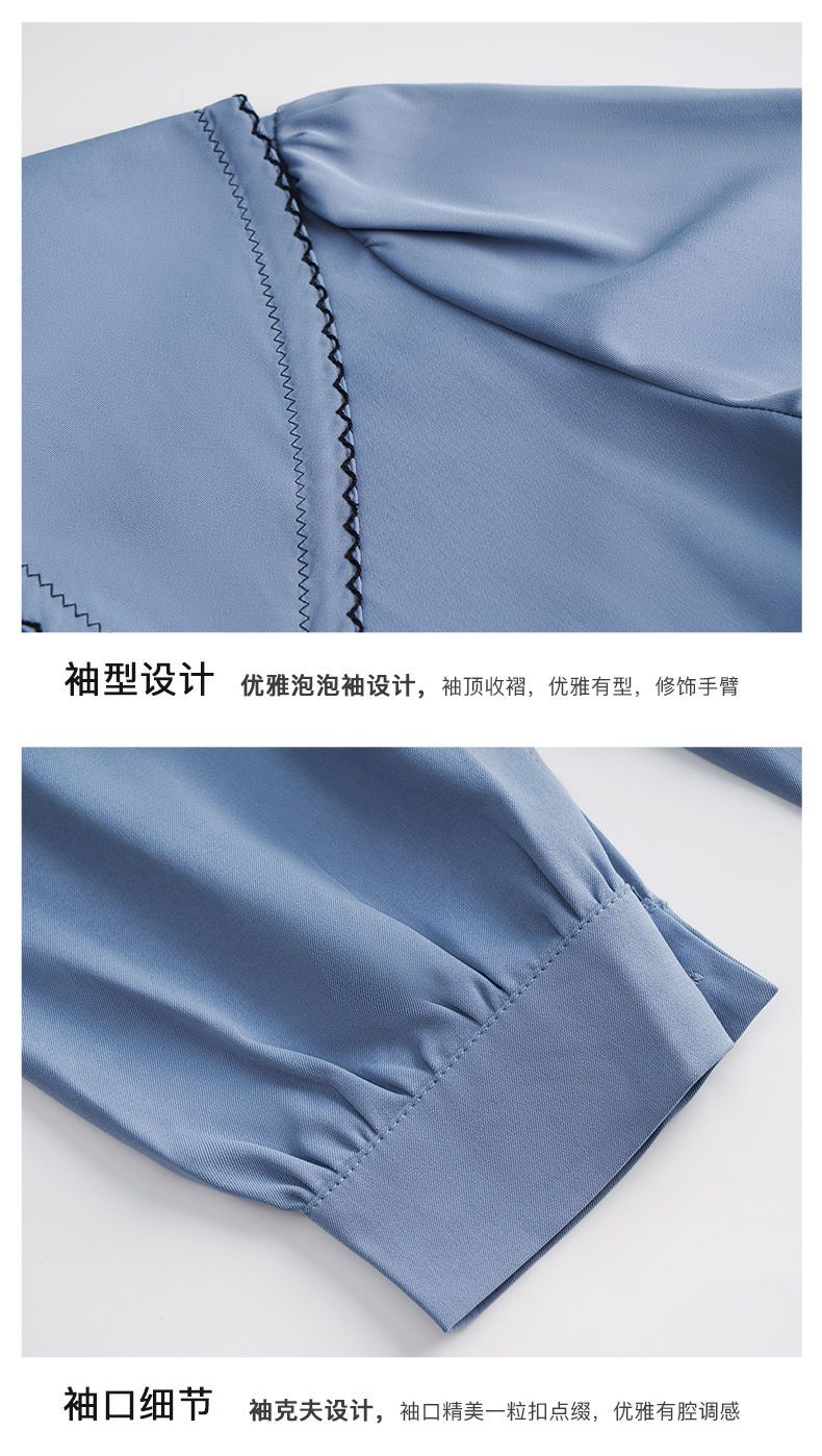 OLrain法式蓝色长袖衬衫女早秋2022年新款宽松泡泡袖垂感刺绣衬衣