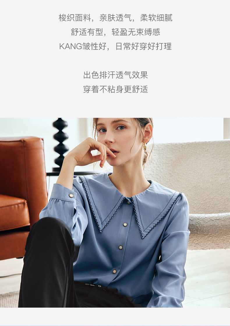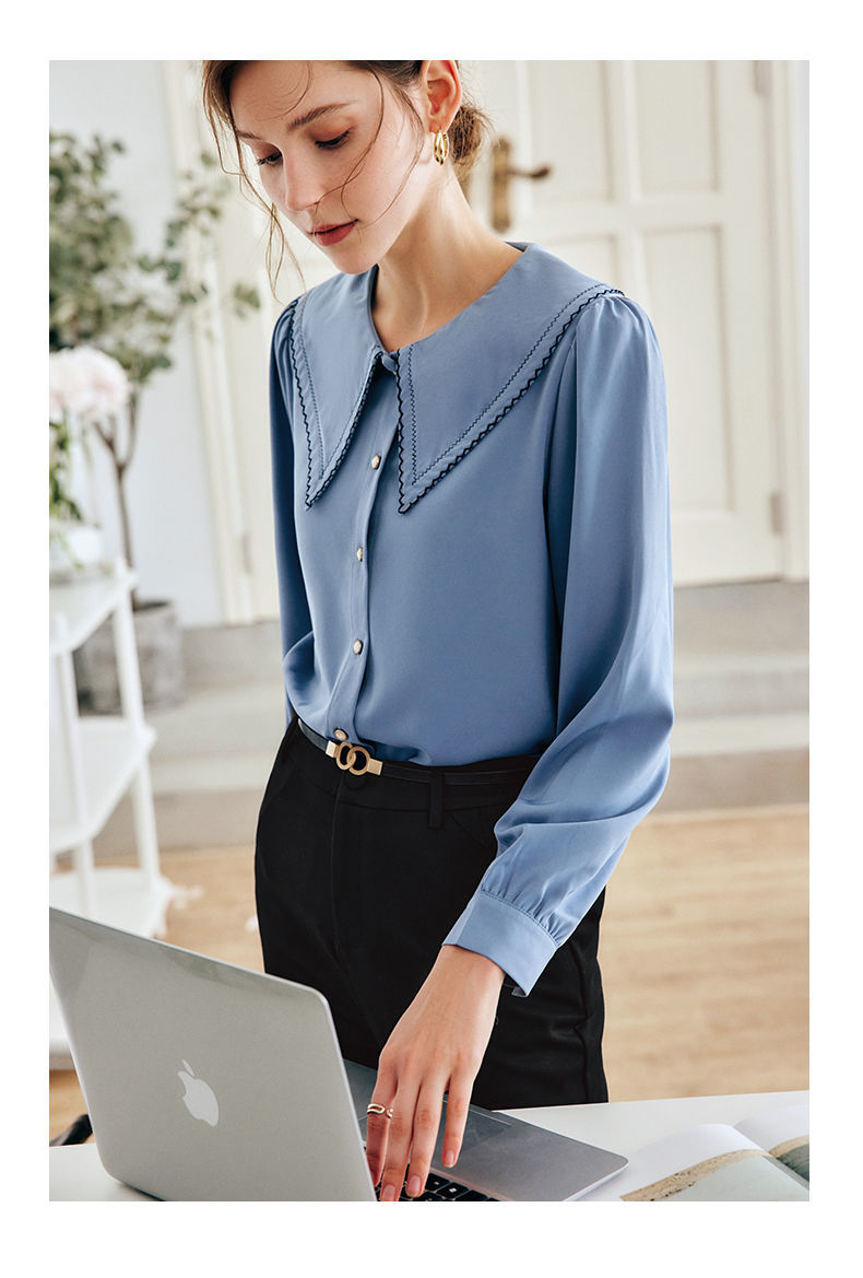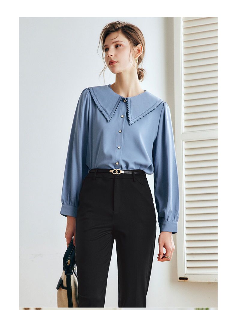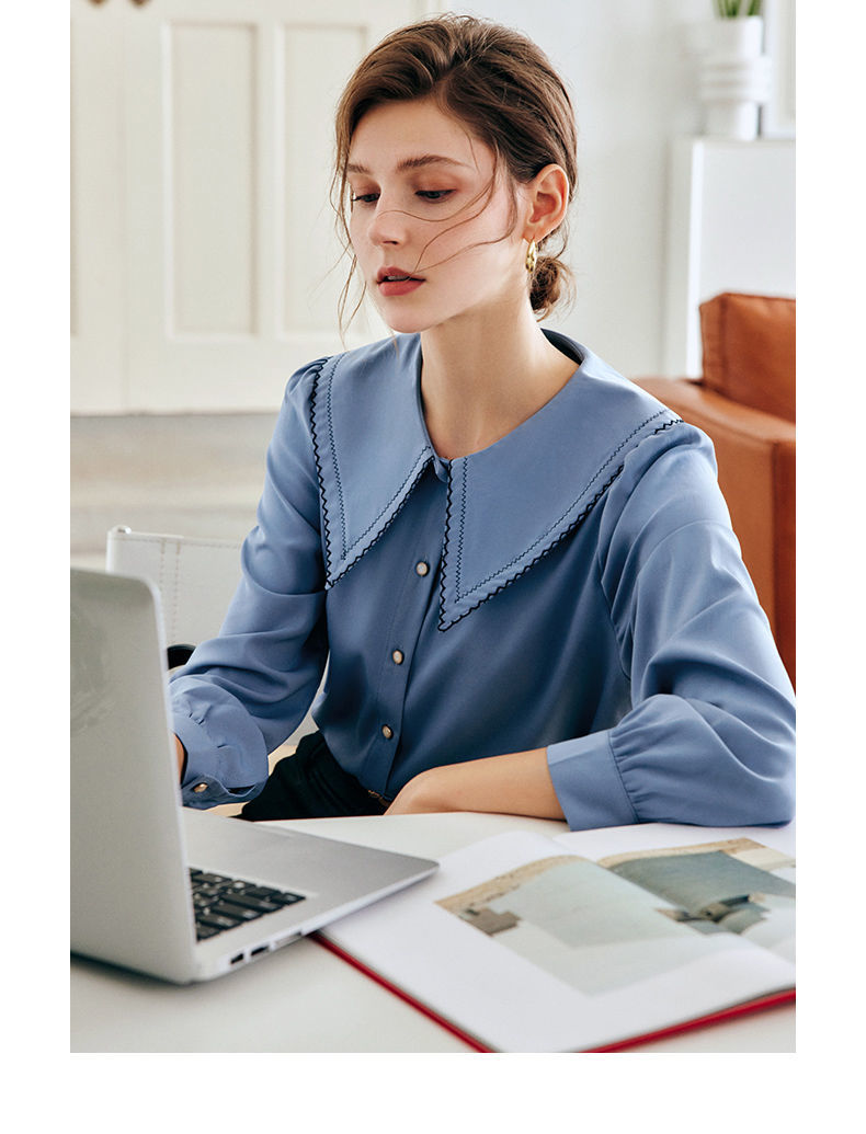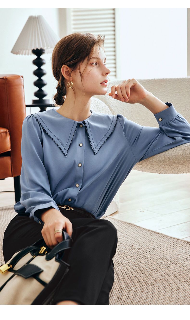 OLrain法式蓝色长袖衬衫女早秋2022年新款宽松泡泡袖垂感刺绣衬衣