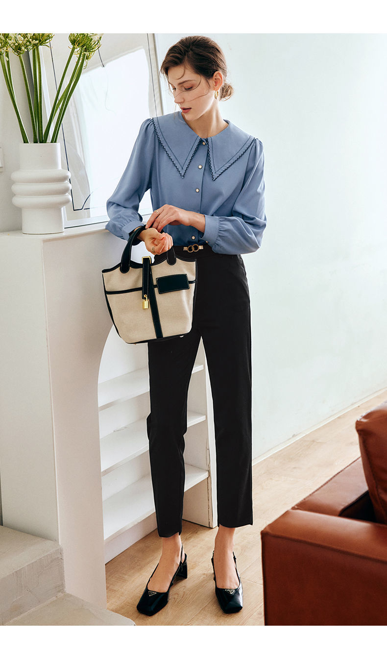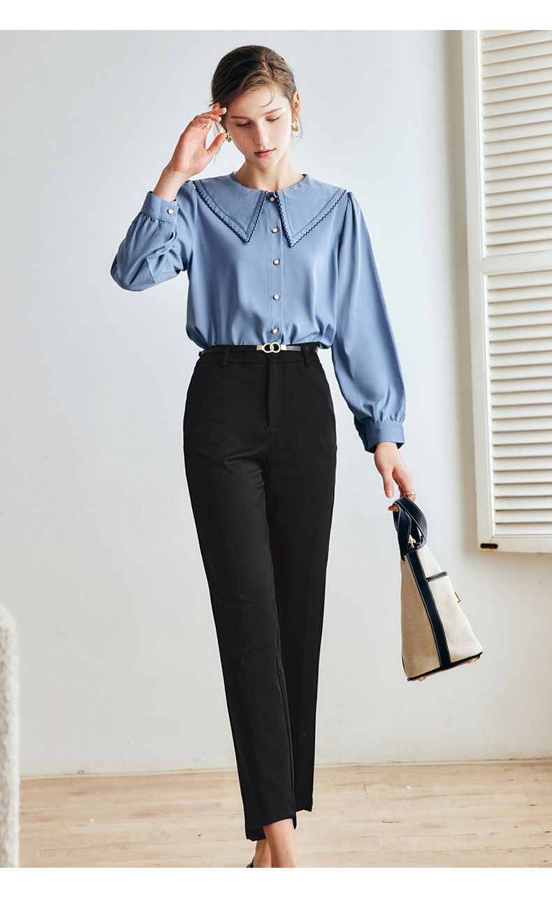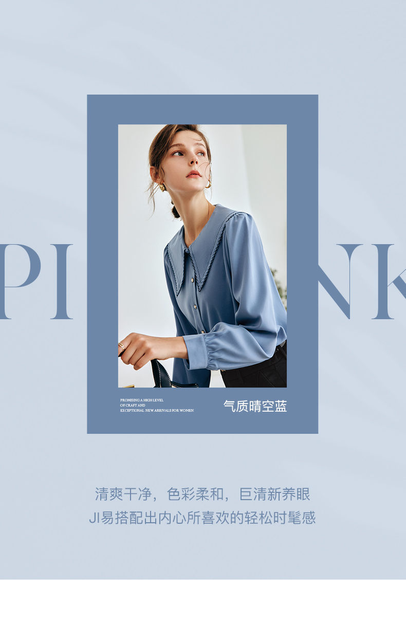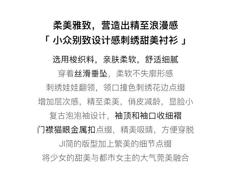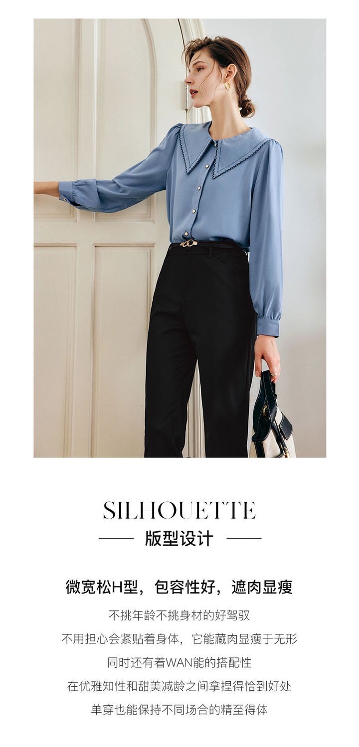 OLrain法式蓝色长袖衬衫女早秋2022年新款宽松泡泡袖垂感刺绣衬衣