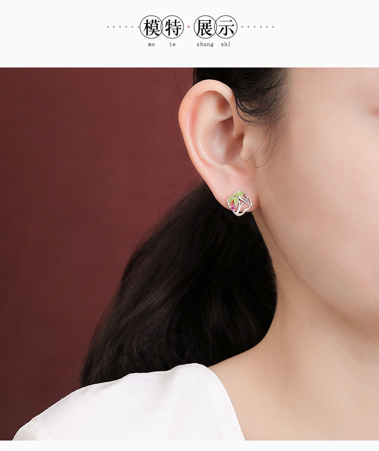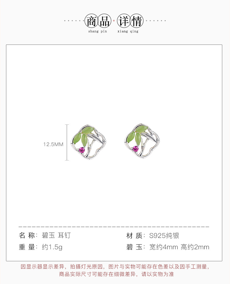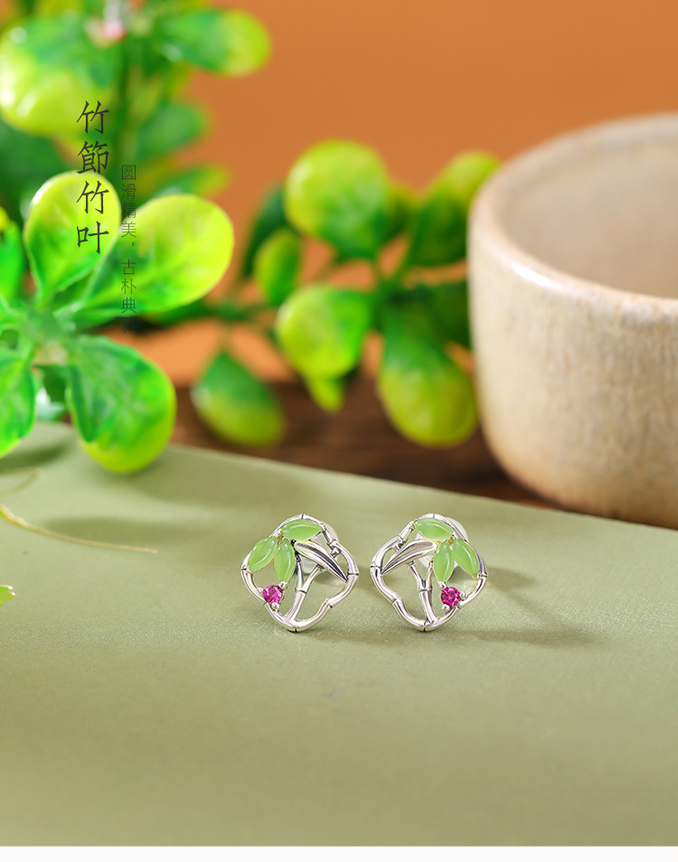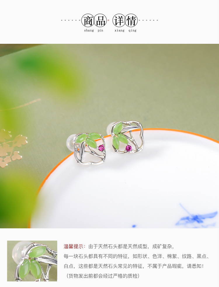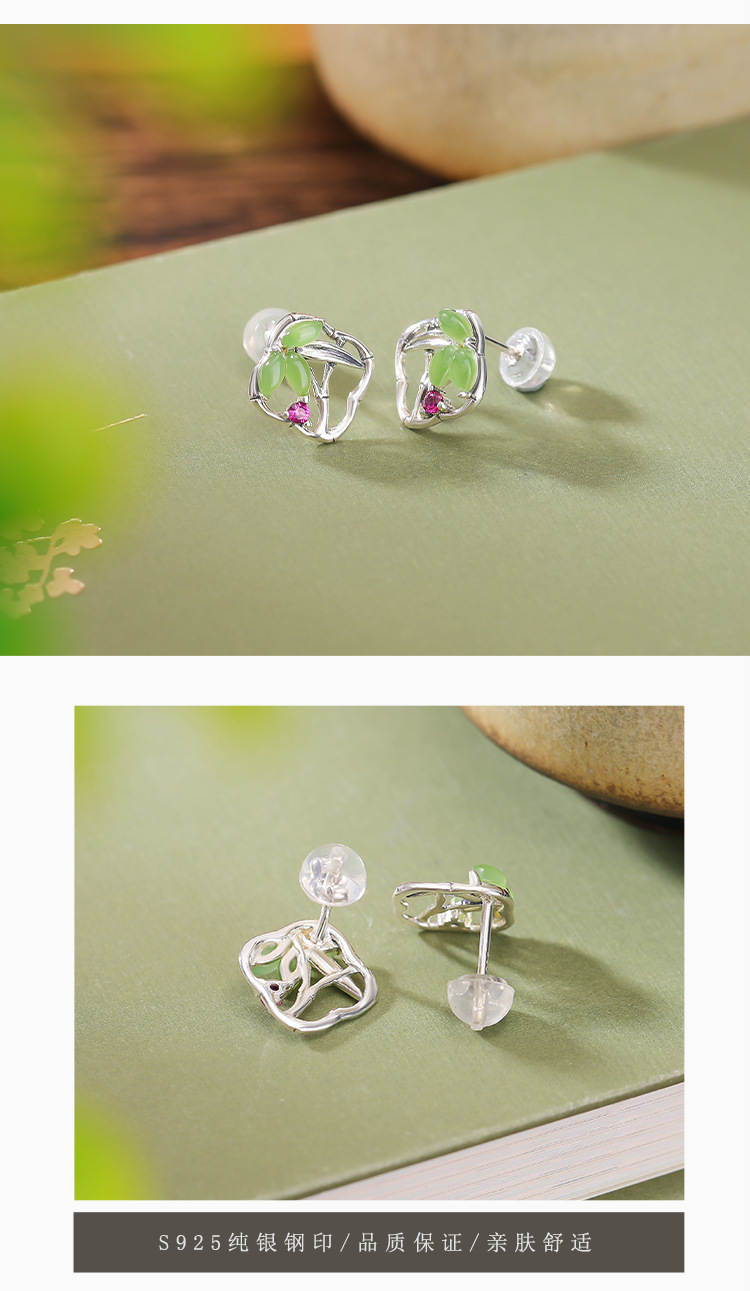 【国风竹海】S925银和田玉碧玉竹节方形耳饰【CW-ED03553】