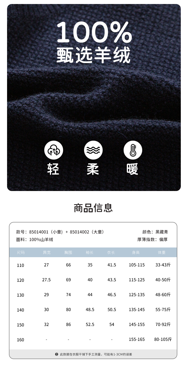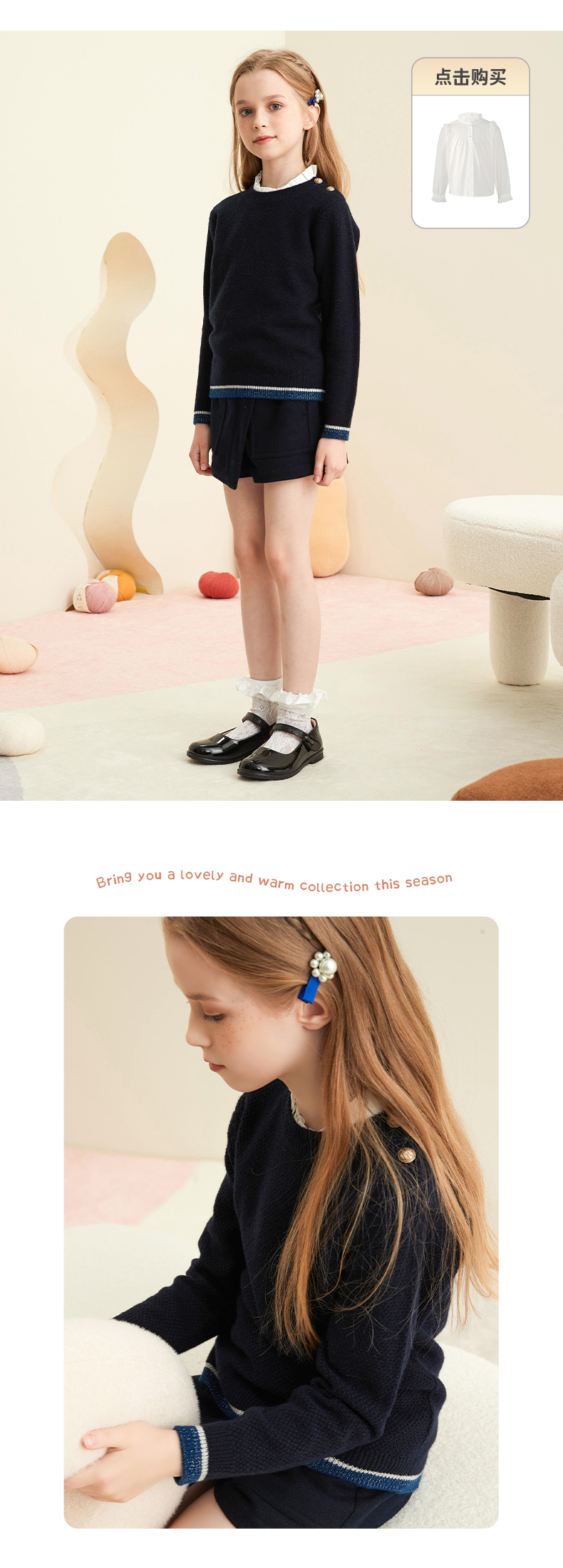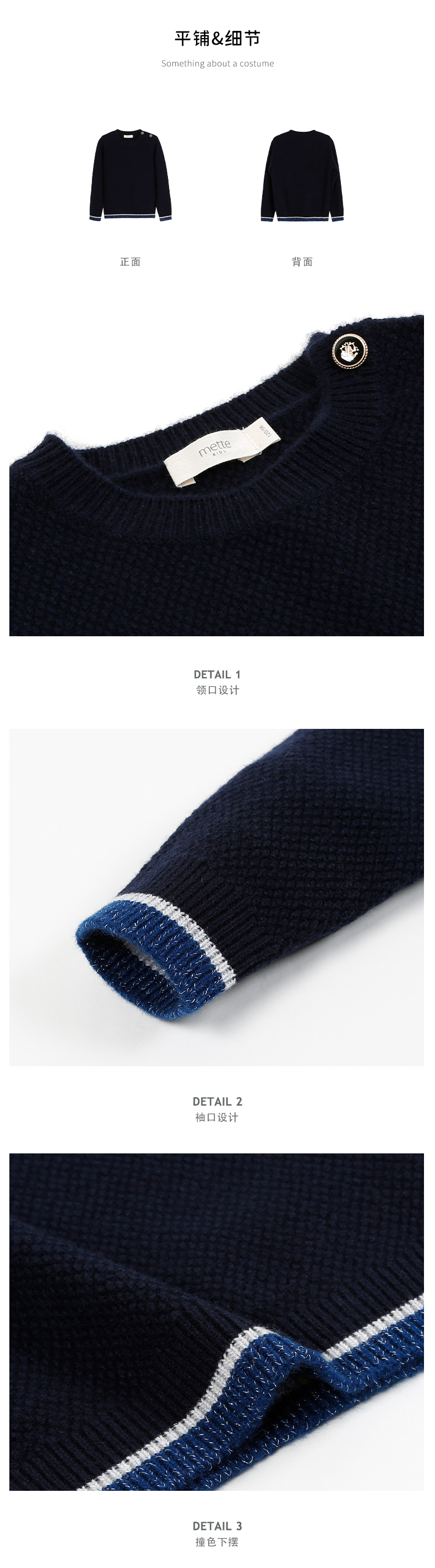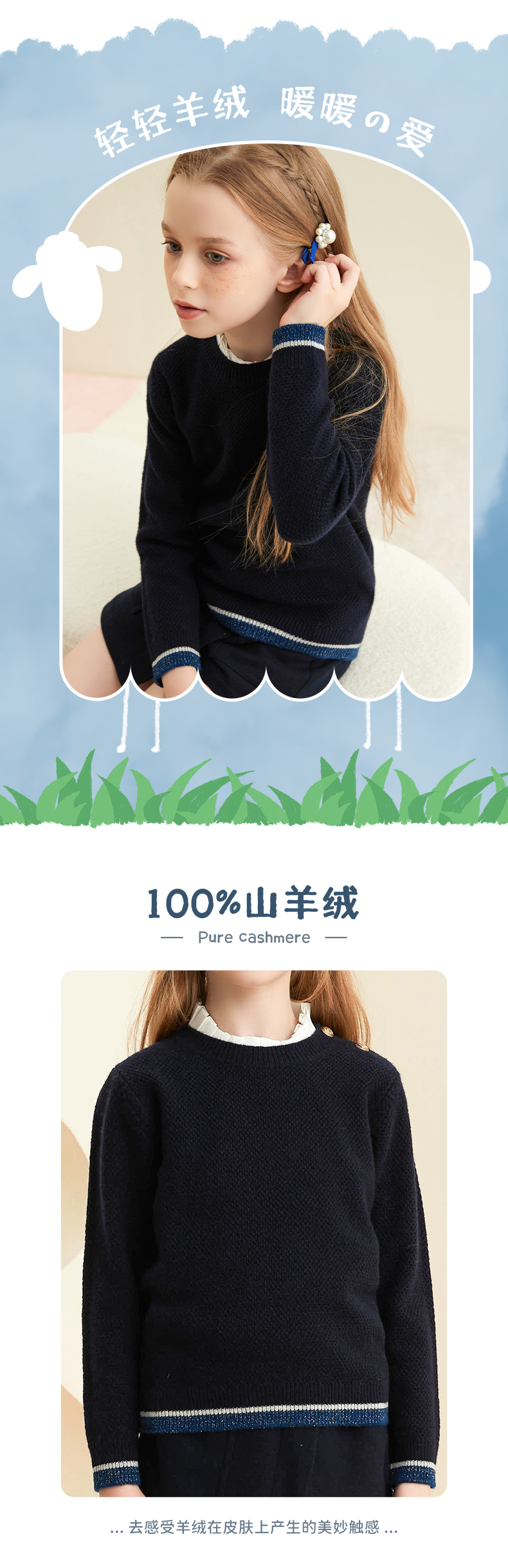 【女童条纹撞色羊绒衫】羊绒世家女童新品100%山羊绒衫时尚纽扣装饰条纹毛衣