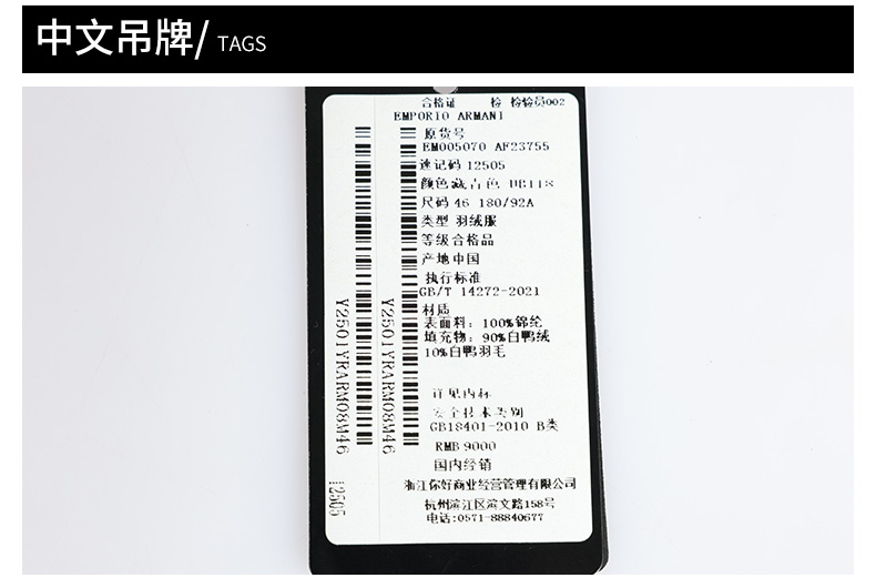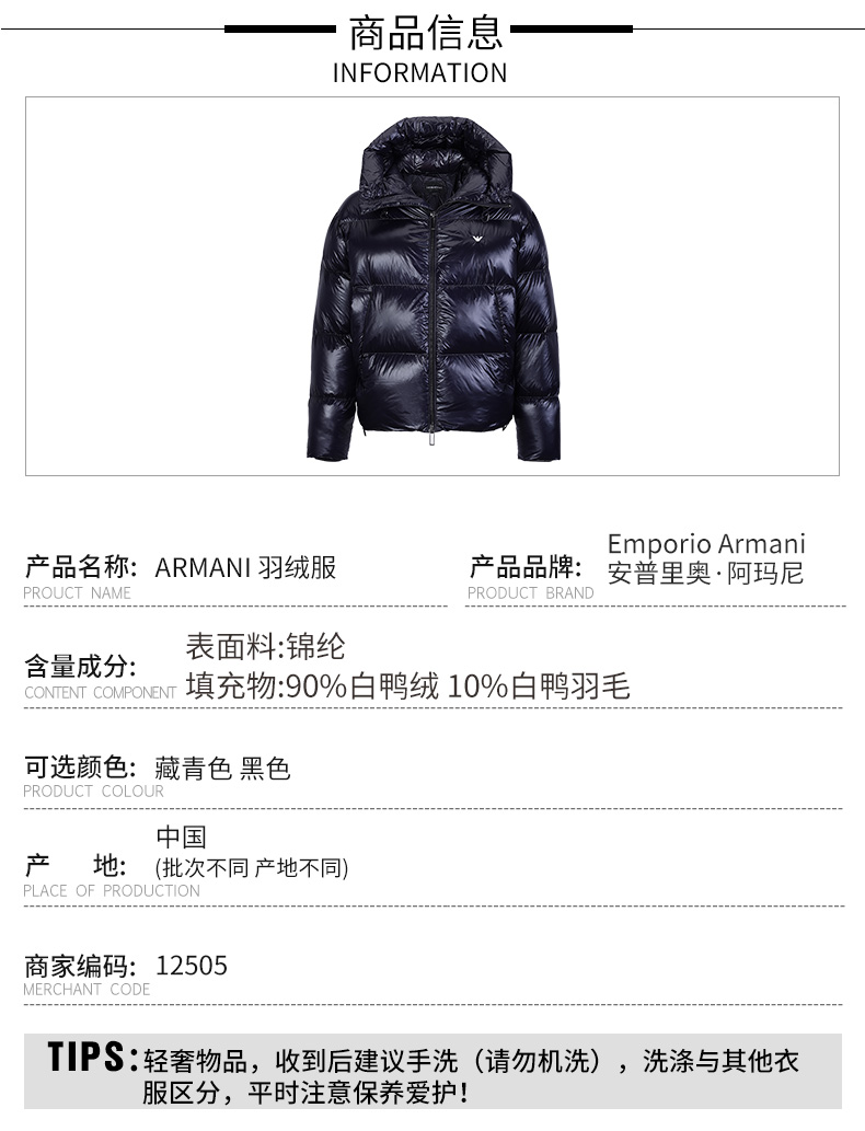 【超惠秒】Emporio Armani 男士舒适抗寒保暖高蓬白鸭绒羽绒服外套12505