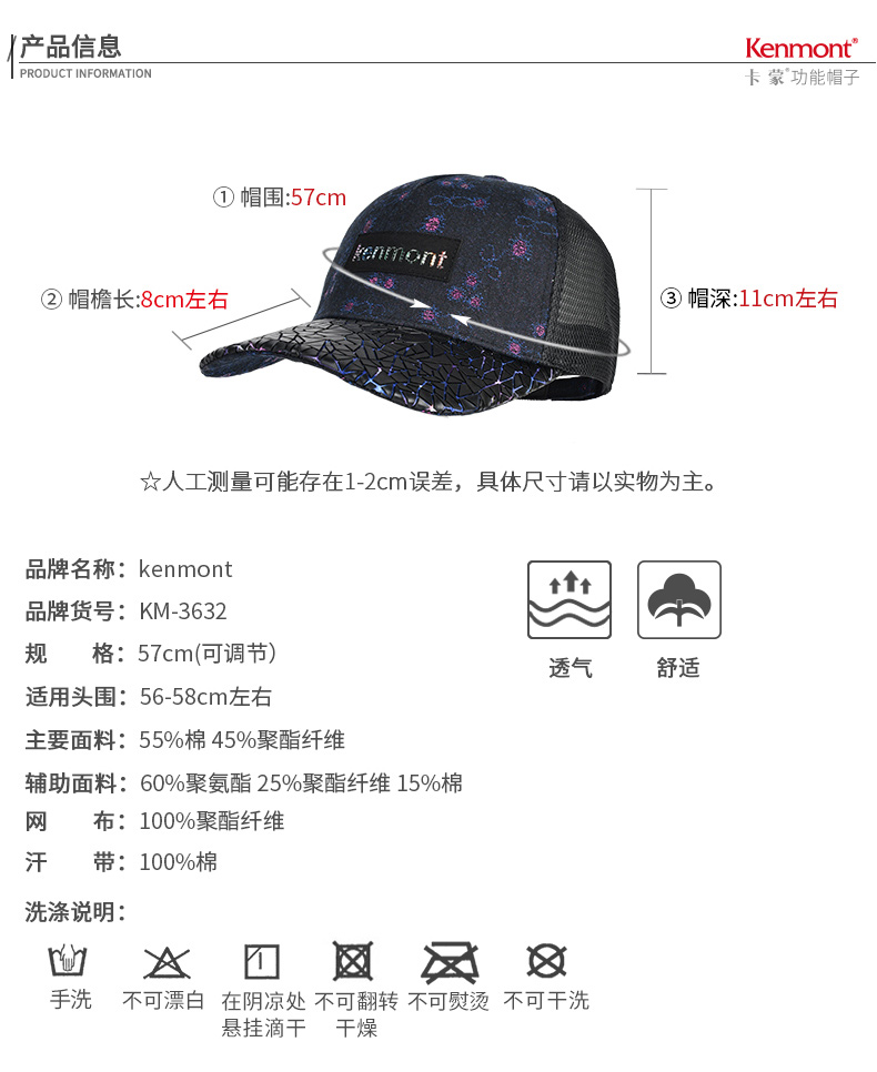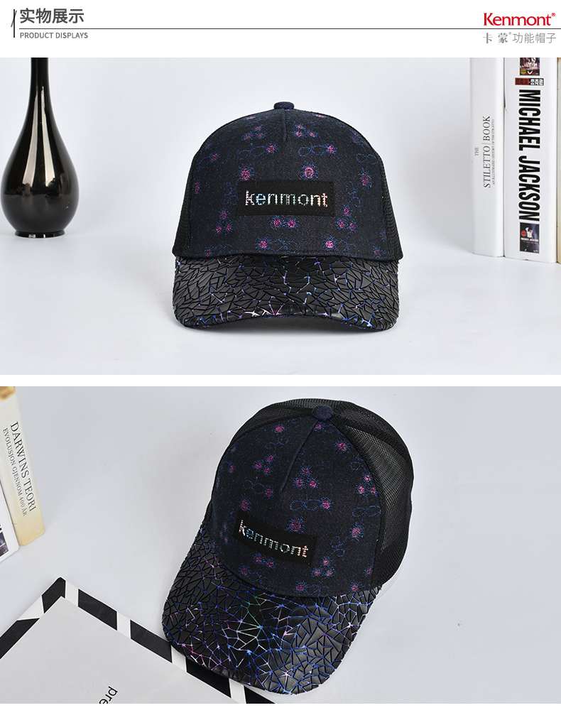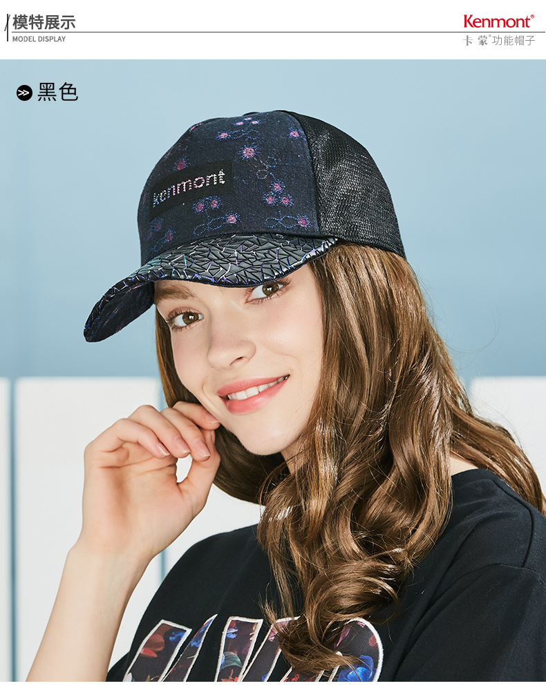 卡蒙户外休闲棒球帽夏季透气遮阳防晒帽子立体帽檐女士牛仔鸭舌帽KM-3632-01