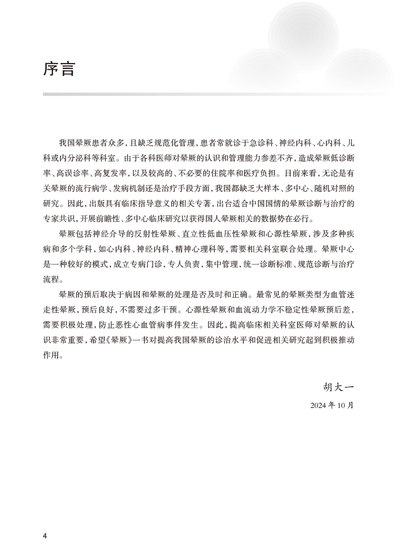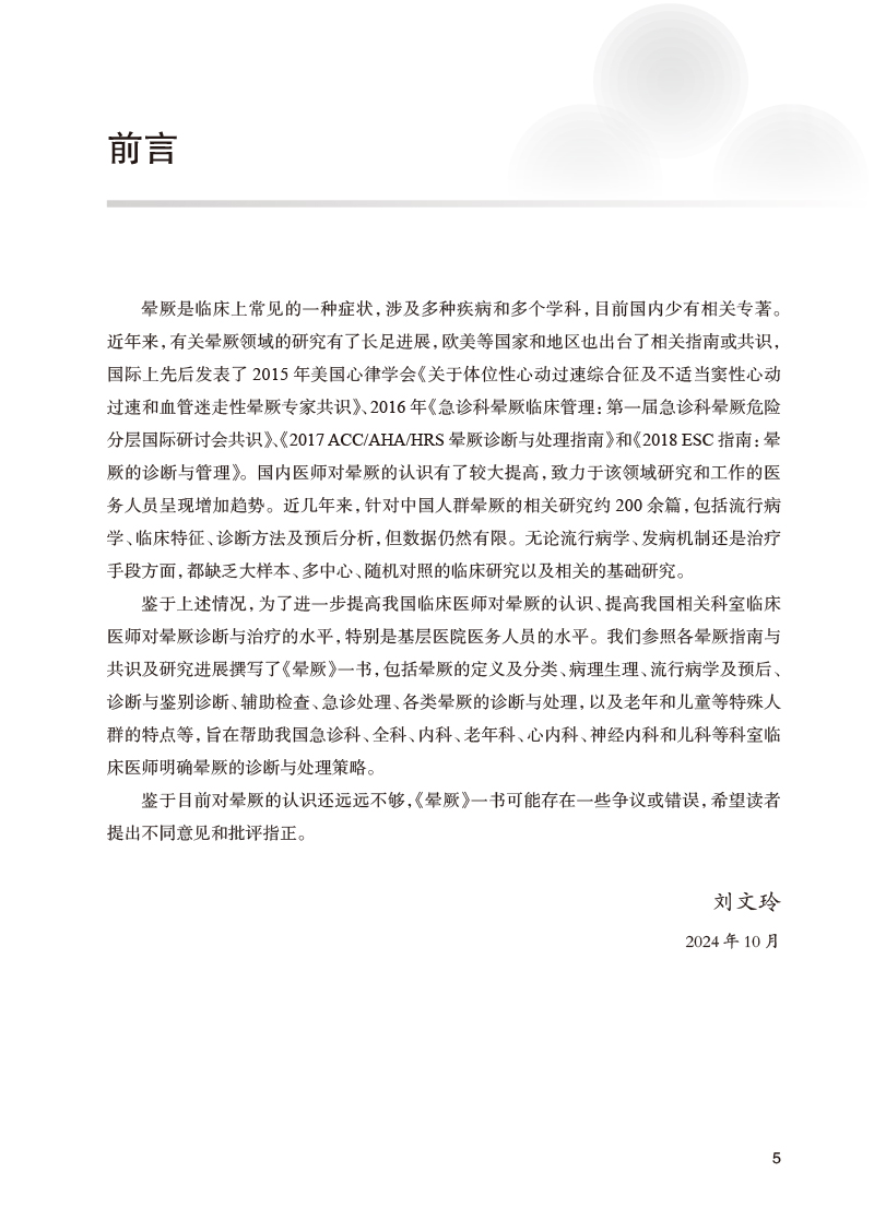 为了进一步提高我国临床医师对晕厥的认识、提高我国相关科室临床医师对晕厥诊断与治疗的水平,特别是基层医院医务人员的水平。参照各晕厥指南与共识及研究进展撰写了《晕厥》一书,全书包括晕厥的定义及分类、病理生理、流行病学及预后、诊断与鉴别诊断、辅助检查、急诊处理、各类晕厥的诊断与处理,以及老年和儿童等特殊人群的特点等,这部专著以晕厥诊断与治疗规范为主要内容,内容涉及多学科。邀请国际上著名晕厥方面的专家Benditt和美籍华人美国明尼苏达大学教授也是该领域的专家作为共同主编,旨在提高我国临床医生对晕厥认识、提高诊断与治疗水平。