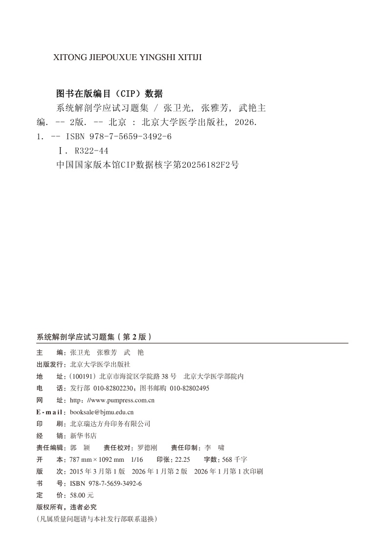 系统解剖学应试习题集 第2二版 十二五普通高等教育本科国家级规划教材辅导用书 张卫光 张雅芳 武艳 主编 北京大学医学出版社