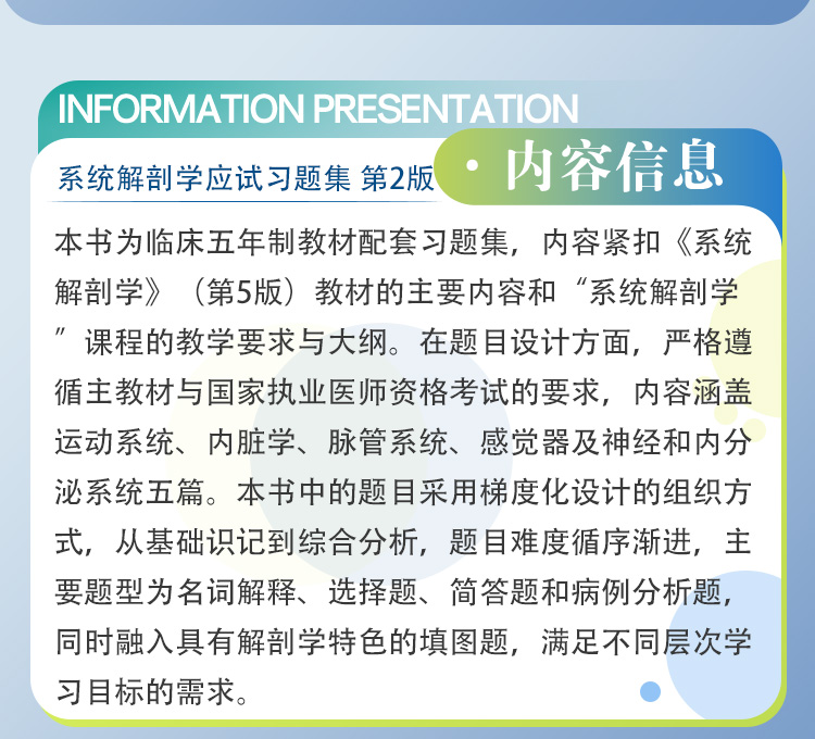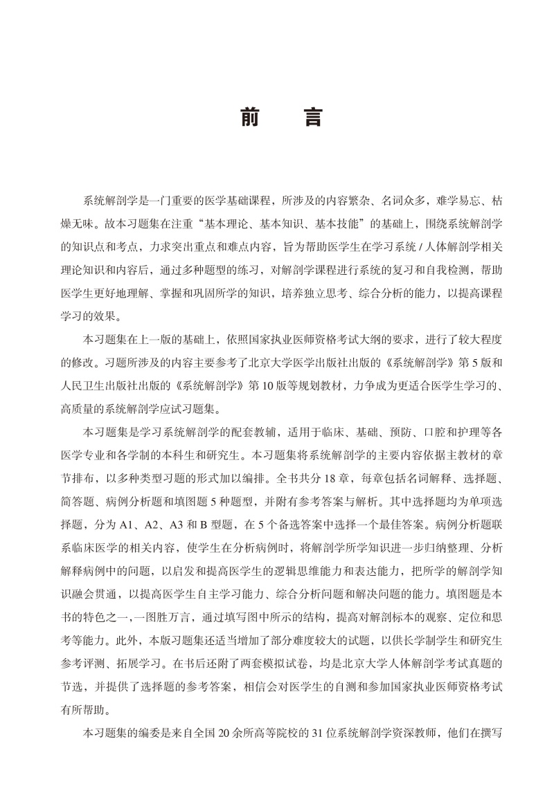本书为临床五年制教材配套习题集,内容紧扣《系统解剖学》(第5版)教材的主要内容和“系统解剖学”课程的教学要求与大纲。在题目设计方面,严格遵循主教材与国家执业医师资格考试的要求,内容涵盖运动系统、内脏学、脉管系统、感觉器及神经和内分泌系统五篇。本书中的题目采用梯度化设计的组织方式,从基础识记到综合分析,题目难度循序渐进,主要题型为名词解释、选择题、简答题和病例分析题,同时融入具有解剖学特色的填图题,满足不同层次学习目标的需求。