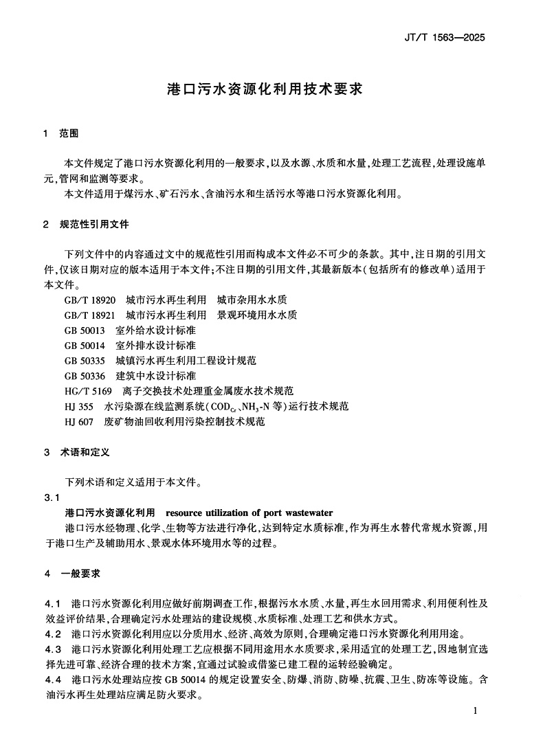 书名:港口污水资源化利用技术要求(JT/T 1563—2025)