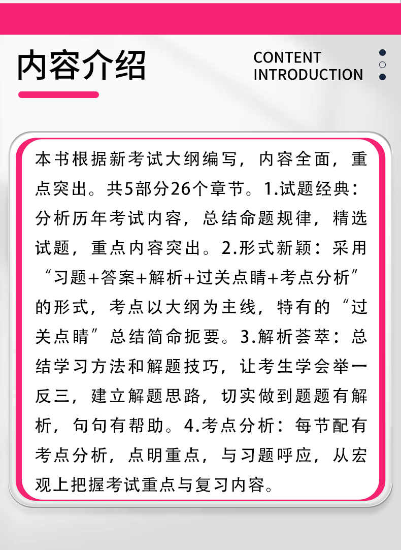 本书根据新考试大纲编写,内容全面,重点突出。共5部分26个章节。 1.试题经典:分析历年考试内容,总结命题规律,精选试题,重点内容突出。 2.形式新颖:采用“习题+答案+解析+过关点睛+考点分析”的形式,考点以大纲为主线,特有的“过关点睛”总结简命扼要。 3.解析荟萃:总结学习方法和解题技巧,让考生学会举一反三,建立解题思路,切实做到题题有解析,句句有帮助。 4.考点分析:每节配有考点分析,点明重点,与习题呼应,从宏观上把握考试重点与复习内容。