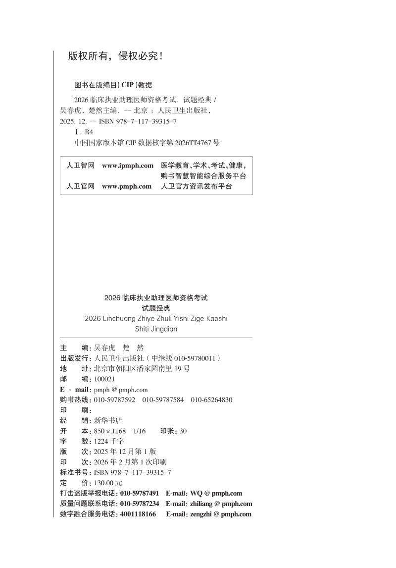 2026临床执业助理医师资格考试 试题经典 吴春虎 楚然 主编 医师资格考试用书 2026执业医师 9787117393157 人民卫生出版社