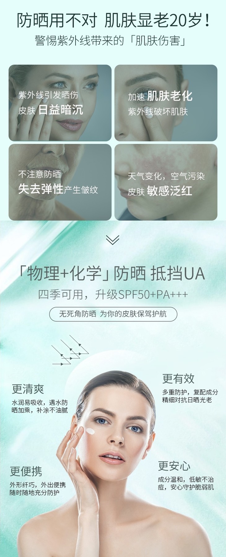 🔻12H面部防晒,温和无刺激 物化结合技术,有效防护紫外线 🔻高效防晒双重防护 同时抵抗UVA、UVB两种紫外线的辐射 🔻防晒指数高达SPF50 PA+++ 为肌肤撑起隐形“保护伞”, 有效隔离紫外线对肌肤的影响, 预防肌肤晒伤、晒黑